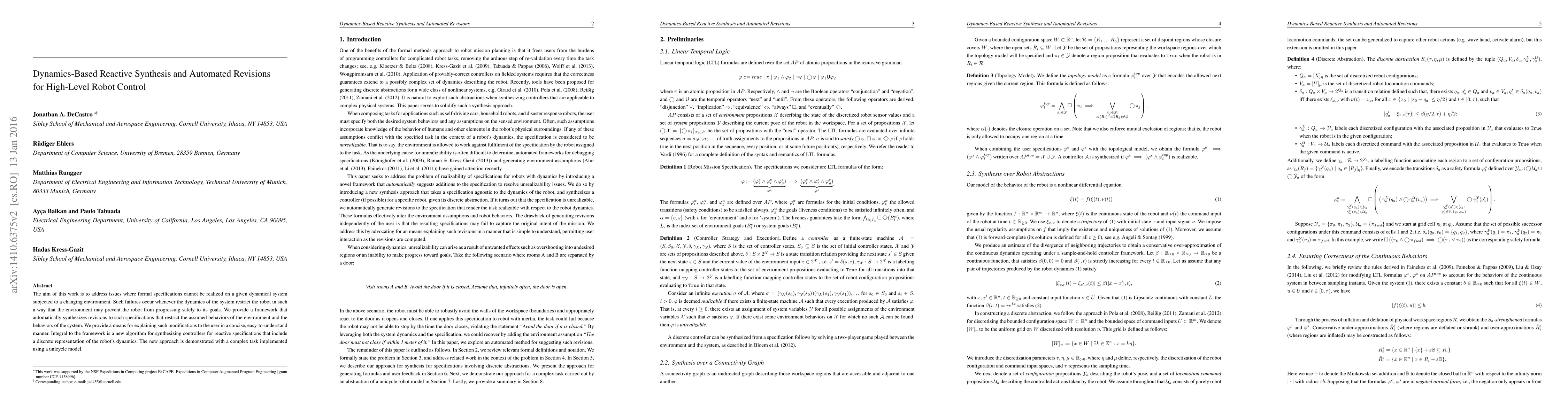 The aim of this work is to address issues where formal specifications cannot be realized on a given dynamical system subjected to a changing environment. Such failures occur whenever the dynamics of the system restrict the robot in such a way that the environment may prevent the robot from progressing safely to its goals. We provide a framework that automatically synthesizes revisions to such specifications that restrict the assumed behaviors of the environment and the behaviors of the system. We provide a means for explaining such modifications to the user in a concise, easy-to-understand manner. Integral to the framework is a new algorithm for synthesizing controllers for reactive specifications that include a discrete representation of the robot's dynamics. The new approach is demonstrated with a complex task implemented using a unicycle model.