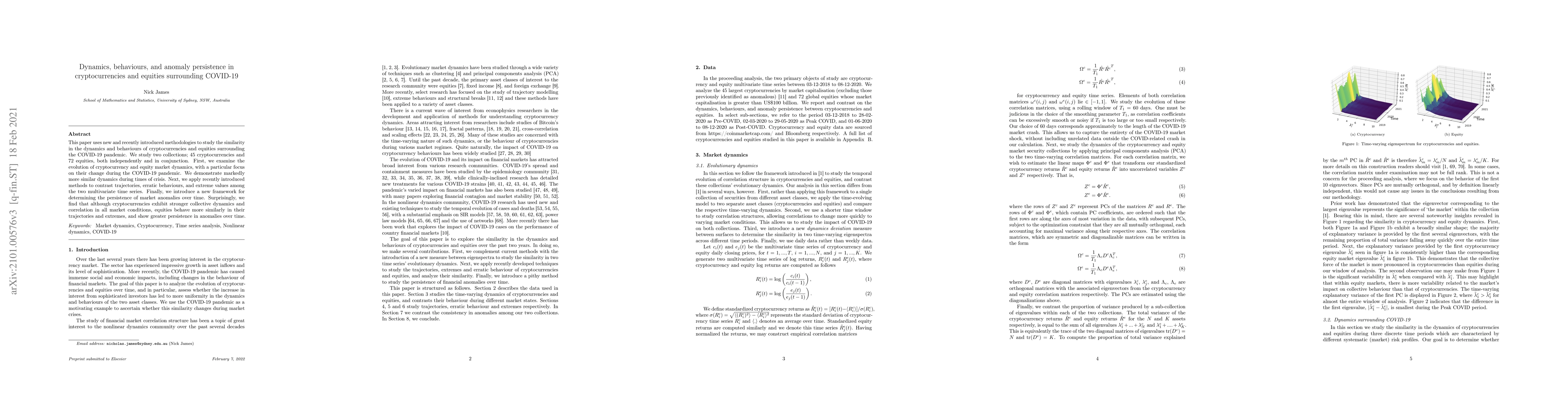 This paper uses new and recently introduced methodologies to study the similarity in the dynamics and behaviours of cryptocurrencies and equities surrounding the COVID-19 pandemic. We study two collections; 45 cryptocurrencies and 72 equities, both independently and in conjunction. First, we examine the evolution of cryptocurrency and equity market dynamics, with a particular focus on their change during the COVID-19 pandemic. We demonstrate markedly more similar dynamics during times of crisis. Next, we apply recently introduced methods to contrast trajectories, erratic behaviours, and extreme values among the two multivariate time series. Finally, we introduce a new framework for determining the persistence of market anomalies over time. Surprisingly, we find that although cryptocurrencies exhibit stronger collective dynamics and correlation in all market conditions, equities behave more similarly in their trajectories, extremes, and show greater persistence in anomalies over time.