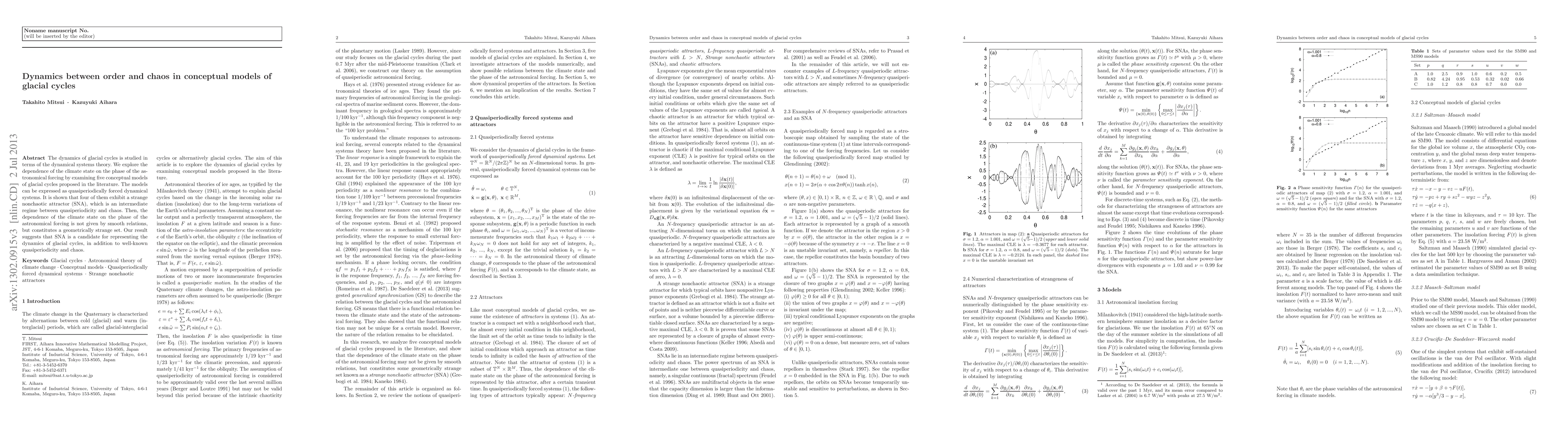 This paper investigates the dynamics of glacial cycles through five conceptual models using dynamical systems theory, revealing that four models exhibit a strange nonchaotic attractor (SNA) instead of smooth quasiperiodic or chaotic behavior, suggesting SNA as a potential dynamic regime for glacial cycles.