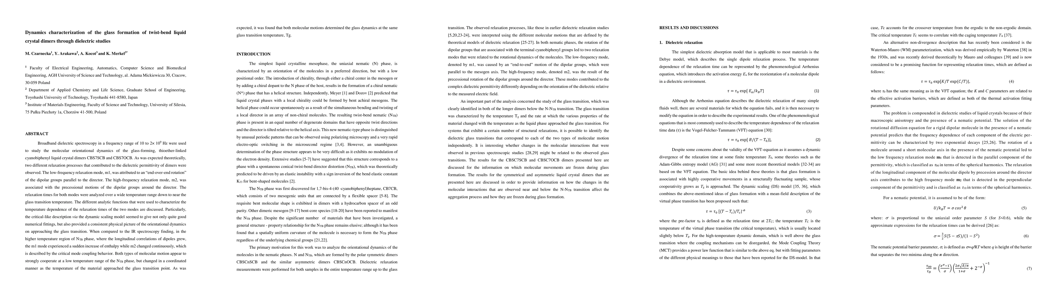This study uses broadband dielectric spectroscopy to characterize the dynamics of glass formation in twist-bend liquid crystal dimers, identifying two distinct relaxation processes. The low-frequency mode (m1) correlates with end-over-end rotations, while the high-frequency mode (m2) relates to precessional motions, both showing cooperative behavior near the glass transition temperature.