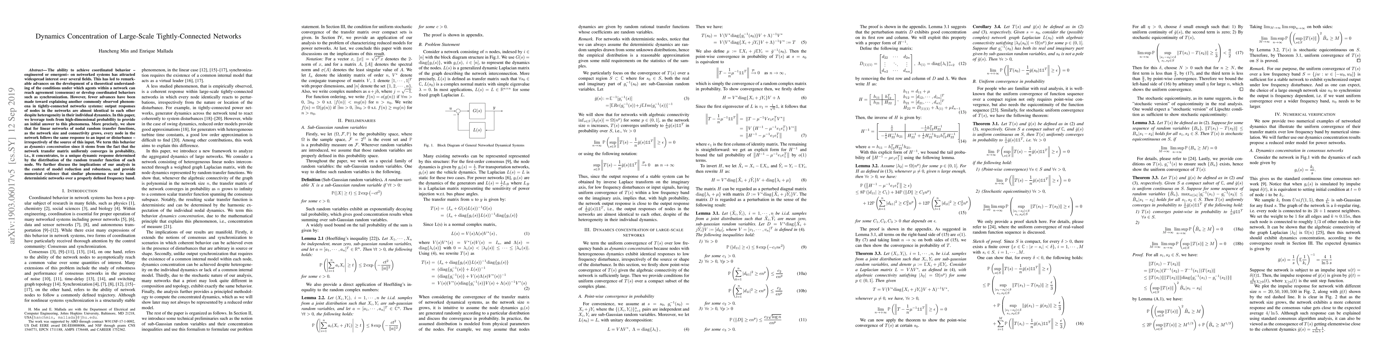 The ability to achieve coordinated behavior --engineered or emergent-- on networked systems has attracted widespread interest over several fields. This has led to remarkable advances on the development of a theoretical understanding of the conditions under which agents within a network can reach agreement (consensus) or develop coordinated behaviors such as synchronization. However, fewer advances have been made toward explaining another commonly observed phenomena in tightly-connected networks systems: output responses of nodes in the networks are almost identical to each other despite heterogeneity in their individual dynamics. In this paper, we leverage tools from high-dimensional probability to provide an initial answer to this phenomena. More precisely, we show that for linear networks of nodal random transfer functions, as the network size and connectivity grows, every node in the network follows the same response to an input or disturbance --irrespectively of the source of this input. We term this behavior as dynamics concentration since it stems from the fact that the network transfer matrix uniformly converges in probability, i.e., it concentrates, to a unique dynamic response determined by the distribution of the random transfer function of each node. We further discuss the implications of our analysis in the context of model reduction and robustness, and provide numerical evidence that similar phenomena occur in small deterministic networks over a properly defined frequency band.