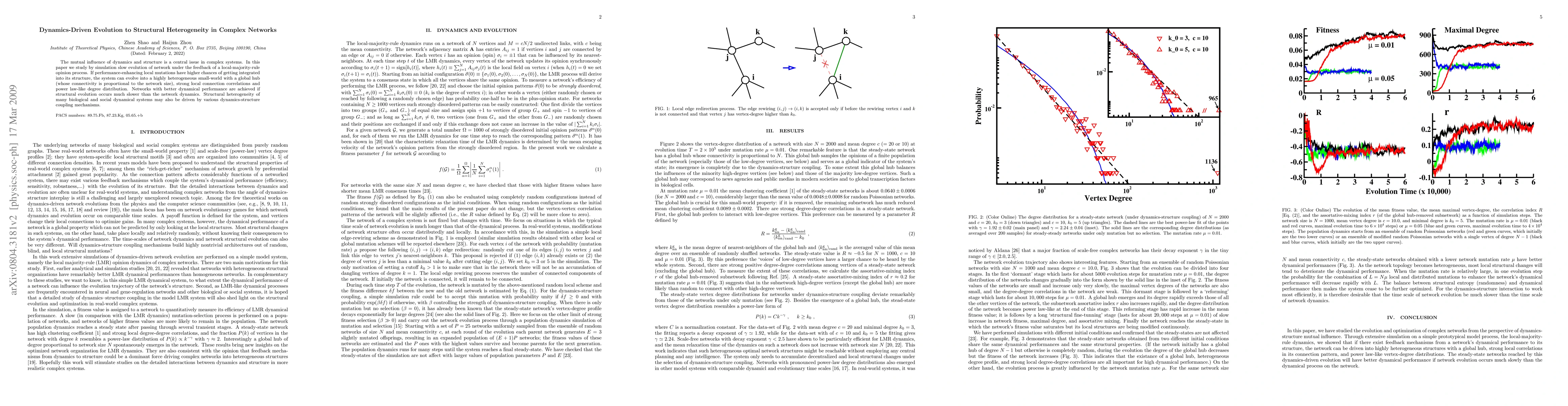 This paper explores how the interplay between dynamics and structure in complex networks leads to the evolution of structural heterogeneity, demonstrating through simulations that slow structural evolution enhances dynamical performance, resulting in a small-world network with a global hub and power law-like degree distribution. The findings suggest that dynamics-structure coupling mechanisms may similarly drive the heterogeneity observed in biological and social systems.