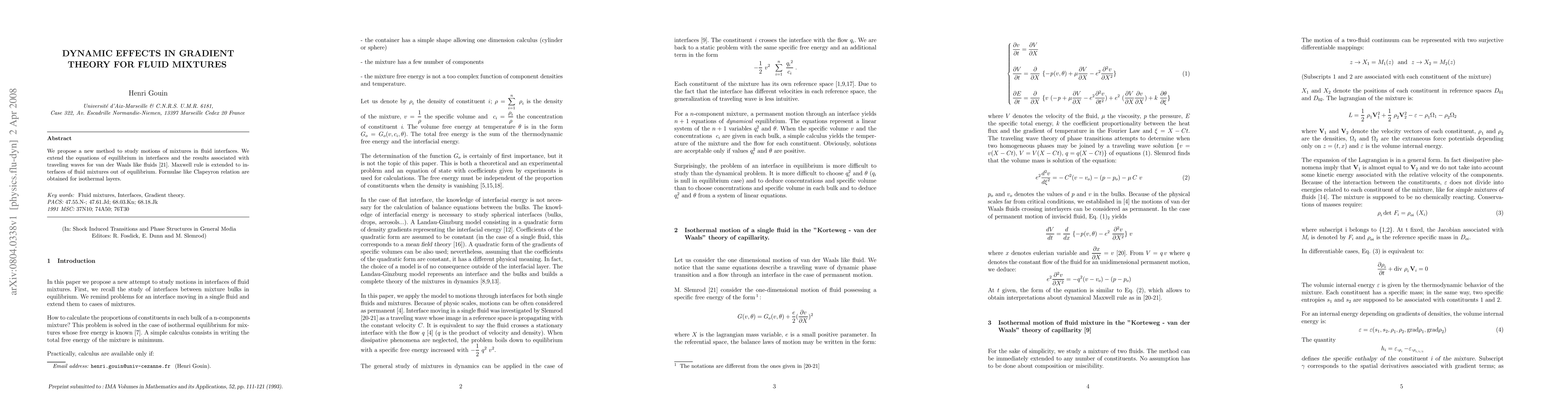 We propose a new method to study motions of mixtures in fluid interfaces. We extend the equations of equilibrium in interfaces and the results associated with travelling waves for van der Waals like fluids. Maxwell rule is extended to interfaces of fluid mixtures out of equilibrium. Formulae like Clapeyron relation are obtained for isothermal layers.