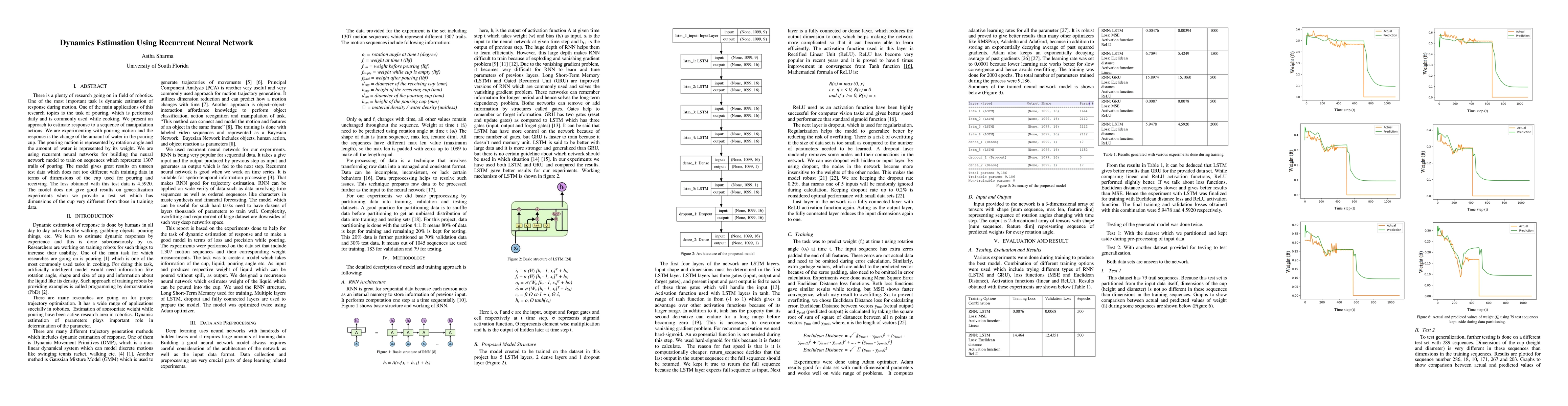 This paper proposes a recurrent neural network model to estimate dynamic response during pouring motions in robotics, achieving good results on similar cup dimensions but struggling with generalization to significantly different cup sizes. The model trains on 1307 pouring trails and achieves a loss of 4.5920 on unseen test data.
