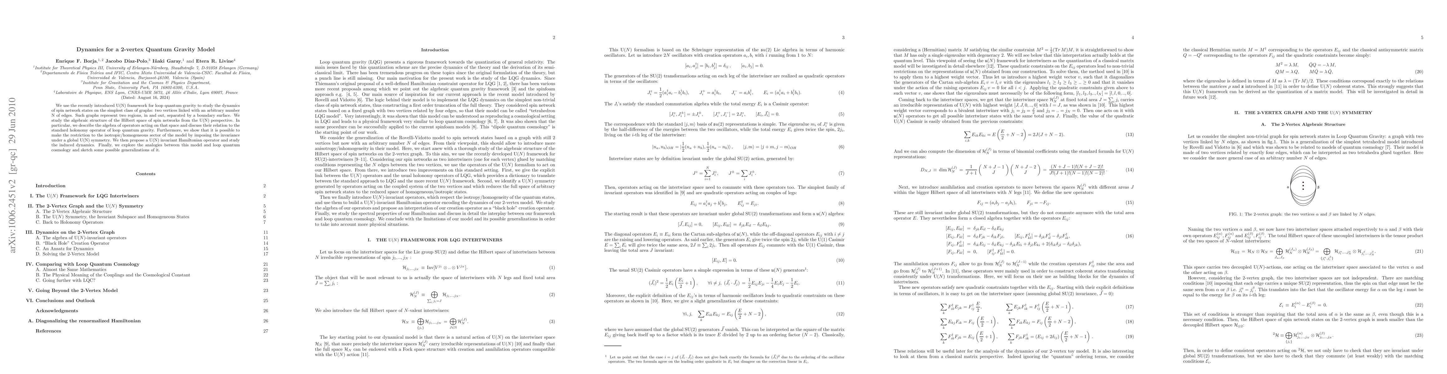 This paper explores the dynamics of a 2-vertex quantum gravity model using the U(N) framework for loop quantum gravity, focusing on spin network states and their algebraic structure. It proposes a U(N) invariant Hamiltonian and discusses its dynamics, drawing parallels to loop quantum cosmology.