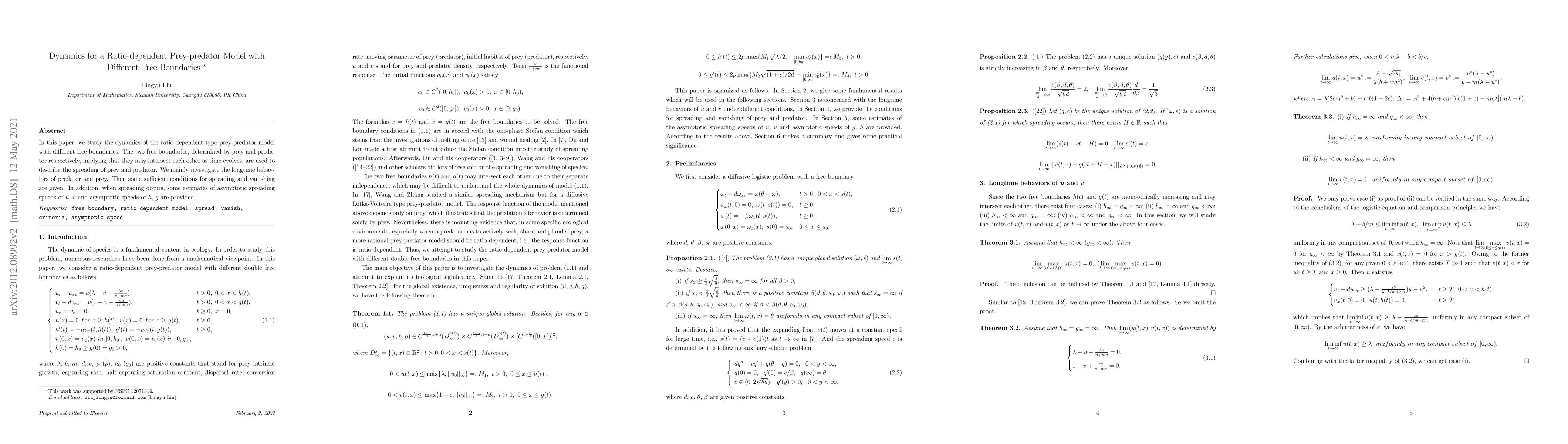 In this paper, we study the dynamics of the ratio-dependent type prey-predator model with different free boundaries. The two free boundaries, determined by prey and predator respectively, implying that they may intersect each other as time evolves, are used to describe the spreading of prey and predator. We mainly investigate the longtime behaviors of predator and prey. Then some sufficient conditions for spreading and vanishing are given. In addition, when spreading occurs, some estimates of asymptotic spreading speeds of u, v and asymptotic speeds of h, g are provided.