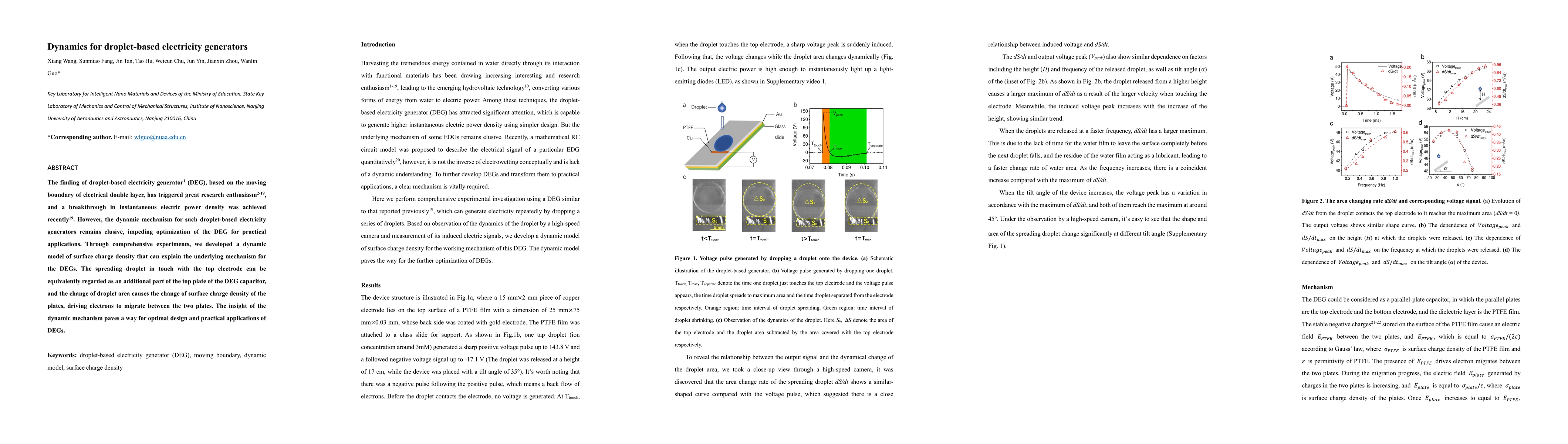 This paper presents a dynamic model explaining the mechanism behind droplet-based electricity generators (DEGs), revealing that the spreading droplet acts as an additional capacitor plate, altering surface charge density and driving electron migration. This insight facilitates the optimization and practical application of DEGs.
