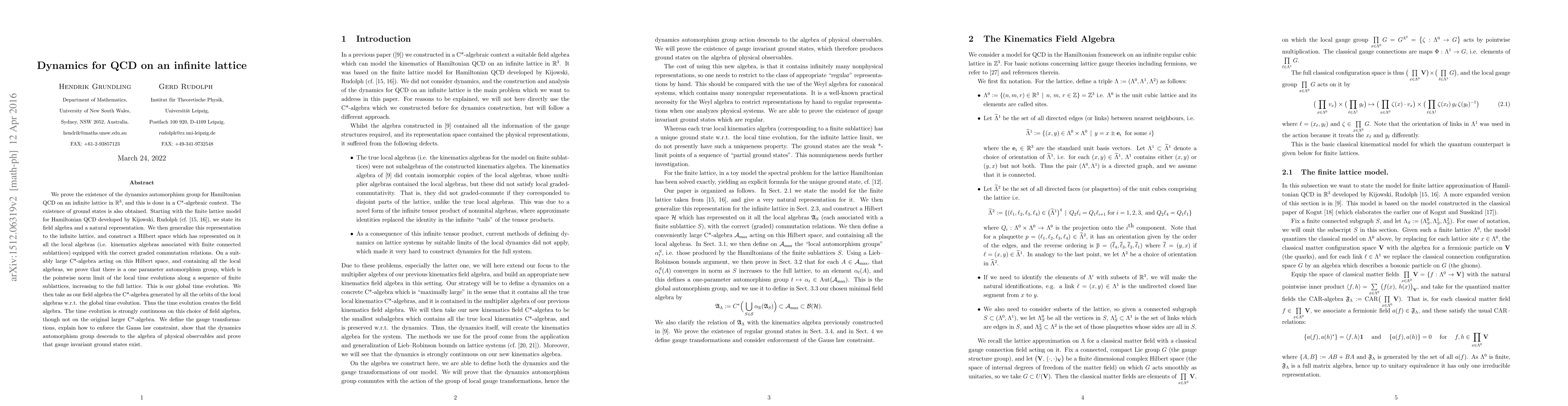 This paper proves the existence of a dynamics automorphism group for Hamiltonian QCD on an infinite lattice in R^3 within a C*-algebraic framework, establishing a global time evolution from local time evolutions. It also demonstrates the existence of gauge invariant ground states and enforces the Gauss law constraint.