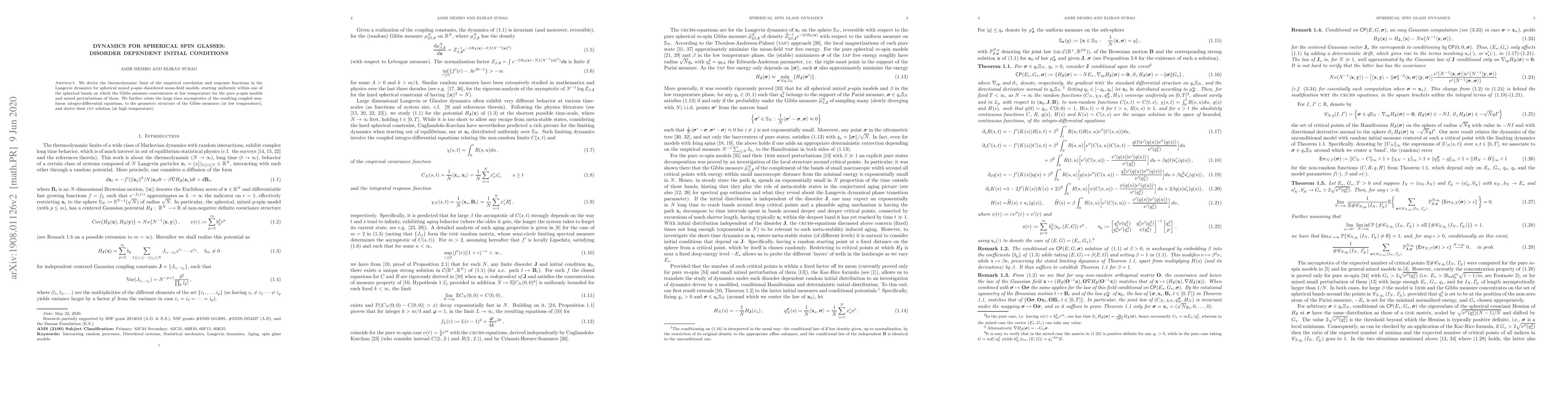 This paper derives the thermodynamic limit of correlation and response functions in spherical spin glasses, focusing on the dynamics starting from uniform initial conditions within a spherical band. It connects the long-term behavior of the system to the geometric structure of Gibbs measures and derives the fluctuation-dissipation theorem solution.