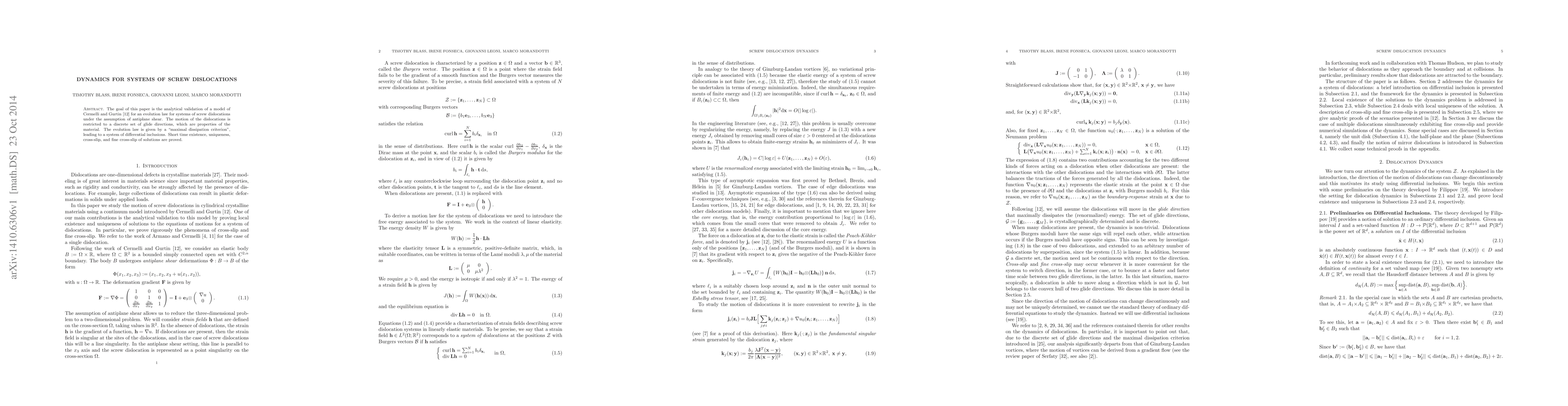 This paper analytically validates Cermelli and Gurtin's model for screw dislocations' evolution under antiplane shear, proving short-time existence, uniqueness, and phenomena like cross-slip through a maximal dissipation criterion leading to differential inclusions.
