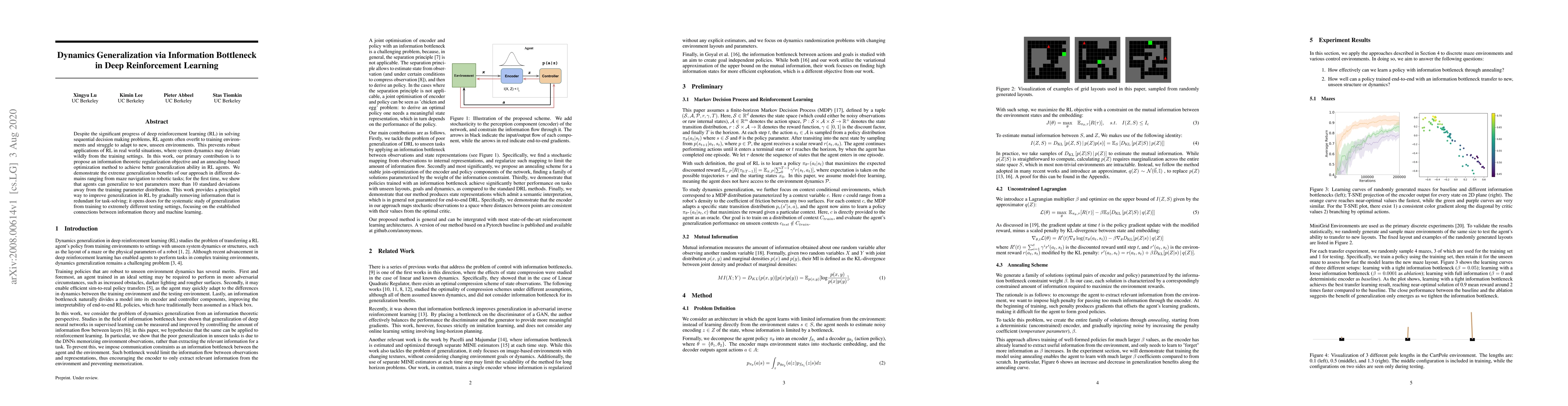 This paper proposes an information theoretic regularization objective and an annealing-based optimization method to enhance generalization in deep reinforcement learning (RL) agents. The approach demonstrates significant improvements in adapting to environments that differ substantially from training settings, achieving generalization to test parameters over 10 standard deviations away from training distributions.