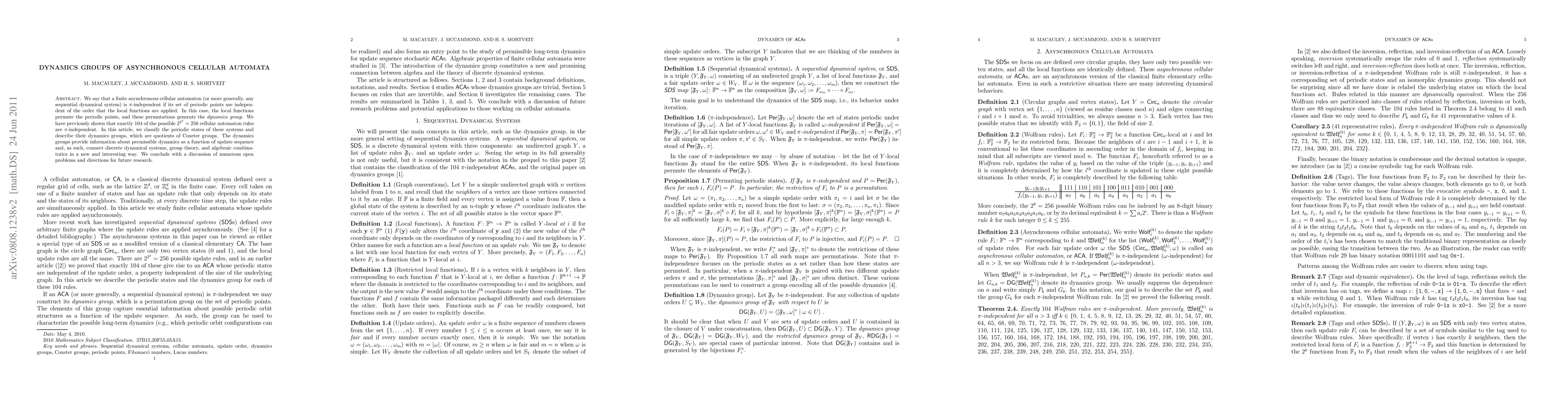 We say that a finite asynchronous cellular automaton (or more generally, any sequential dynamical system) is pi-independent if its set of periodic points are independent of the order that the local functions are applied. In this case, the local functions permute the periodic points, and these permutations generate the dynamics group. We have previously shown that exactly 104 of the possible 256 cellular automaton rules are pi-independent. In this article, we classify the periodic states of these systems and describe their dynamics groups, which are quotients of Coxeter groups. The dynamics groups provide information about permissible dynamics as a function of update sequence and, as such, connect discrete dynamical systems, group theory, and algebraic combinatorics in a new and interesting way. We conclude with a discussion of numerous open problems and directions for future research.