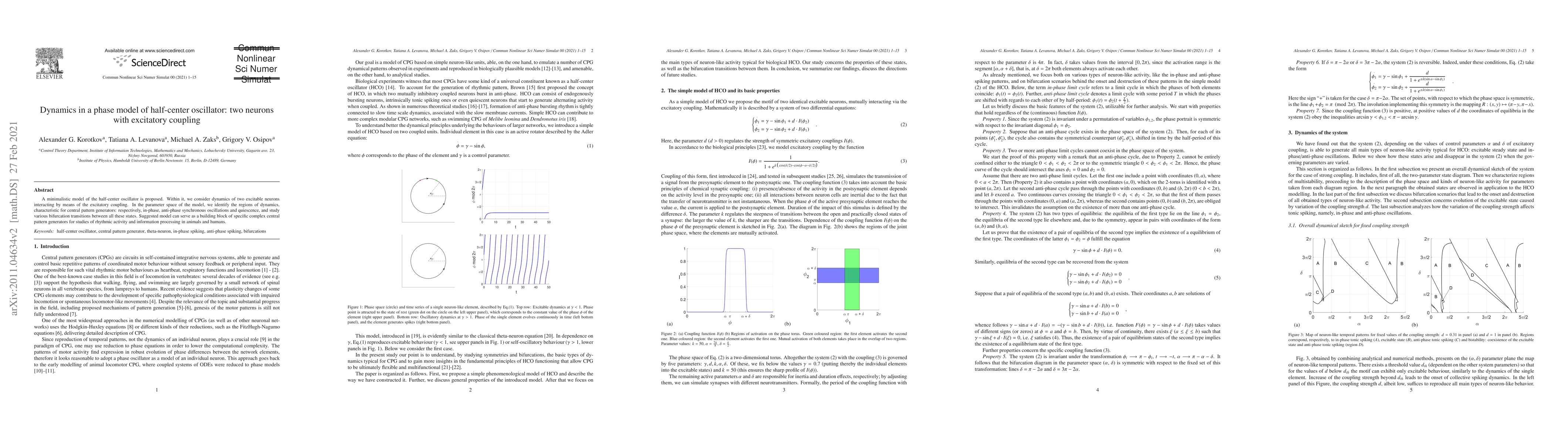 This paper proposes a minimalistic phase model of a half-center oscillator with two excitable neurons connected via excitatory coupling, identifying regions of in-phase, anti-phase oscillations, and quiescence in its parameter space, and studying the bifurcation transitions between these states. The model serves as a foundational component for studying rhythmic activity and information processing in biological systems.