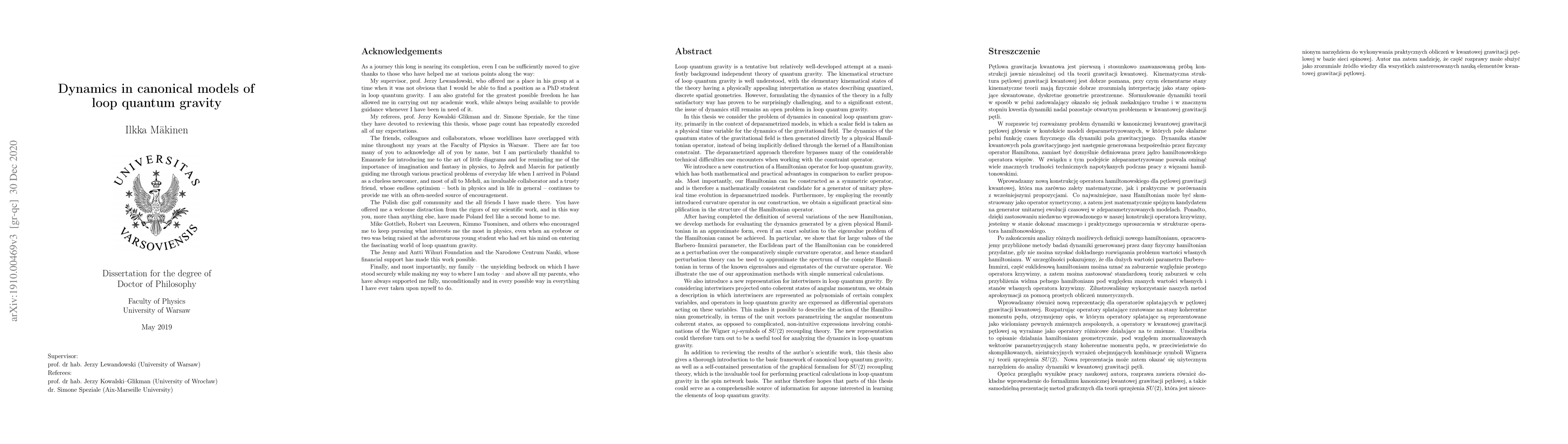 In this thesis we consider the problem of dynamics in canonical loop quantum gravity, primarily in the context of deparametrized models, in which a scalar field is taken as a physical time variable for the dynamics of the gravitational field. The dynamics of the quantum states of the gravitational field is then generated directly by a physical Hamiltonian operator, instead of being implicitly defined through the kernel of a Hamiltonian constraint. We introduce a new construction of a Hamiltonian operator for loop quantum gravity, which has both mathematical and practical advantages in comparison to earlier proposals. Most importantly, the new Hamiltonian can be constructed as a symmetric operator, and is therefore a mathematically consistent candidate for a generator of physical time evolution in deparametrized models. We develop methods for approximately evaluating the dynamics generated by a given physical Hamiltonian, even if an exact solution to the eigenvalue problem of the Hamiltonian cannot be achieved. We also introduce a new representation for intertwiners in loop quantum gravity, based on projecting intertwiners onto coherent states of angular momentum, and in which intertwiners are represented as polynomials of certain complex variables, and operators in loop quantum gravity are expressed as differential operators acting on these variables. In addition to reviewing the results of the author's scientific work, this thesis also gives a thorough introduction to the basic framework of canonical loop quantum gravity, and a self-contained presentation of the graphical formalism for SU(2) recoupling theory, which is the invaluable tool for performing practical calculations in loop quantum gravity. The author therefore hopes that parts of this thesis could serve as a comprehensible source of information for anyone interested in learning the elements of loop quantum gravity.