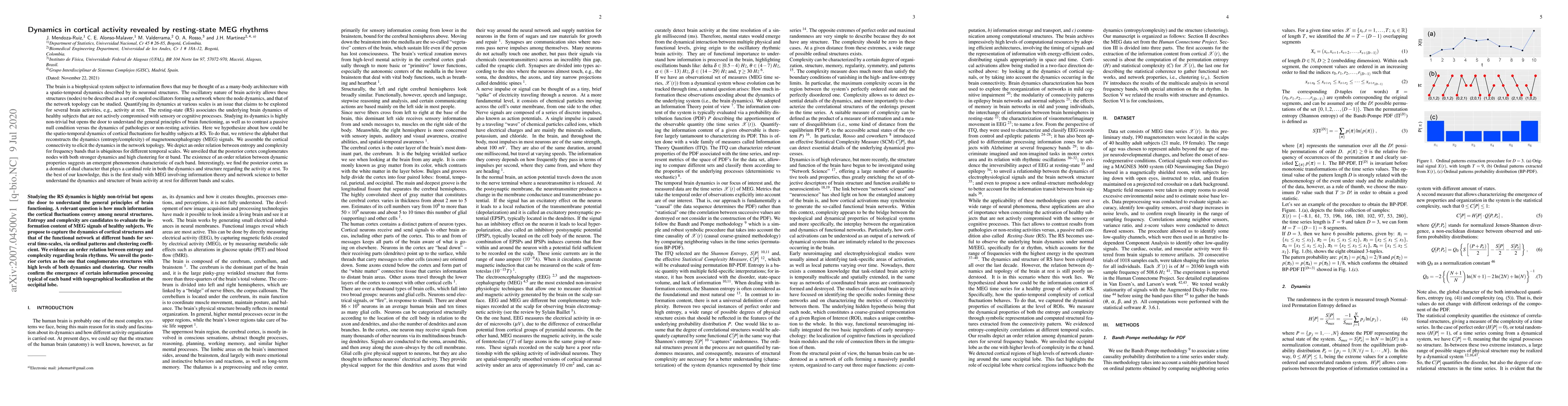 This study uses magnetoencephalography (MEG) and information theory to explore the spatio-temporal dynamics of cortical activity during resting-state. It reveals that the posterior cortex exhibits stronger dynamics and higher clustering in the alpha band, suggesting a key role in the emergent phenomena of resting-state brain activity.
