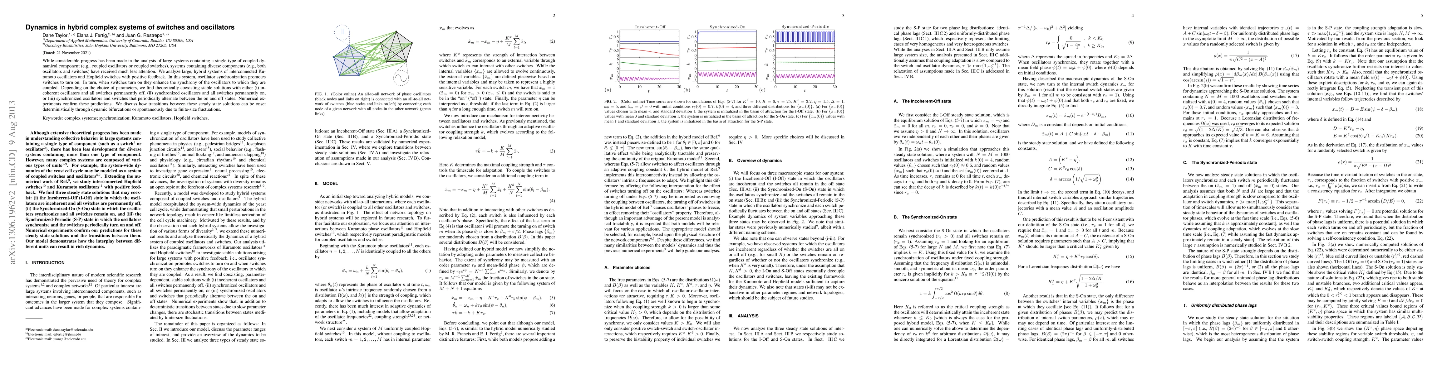 This paper investigates hybrid complex systems combining Kuramoto oscillators and Hopfield switches with positive feedback, revealing coexisting stable states: incoherent oscillators with off switches, synchronized oscillators with all switches on, or synchronized oscillators with switches periodically alternating. Numerical experiments validate theoretical predictions, and transitions between these states are shown to occur via dynamic bifurcations or spontaneous fluctuations.
