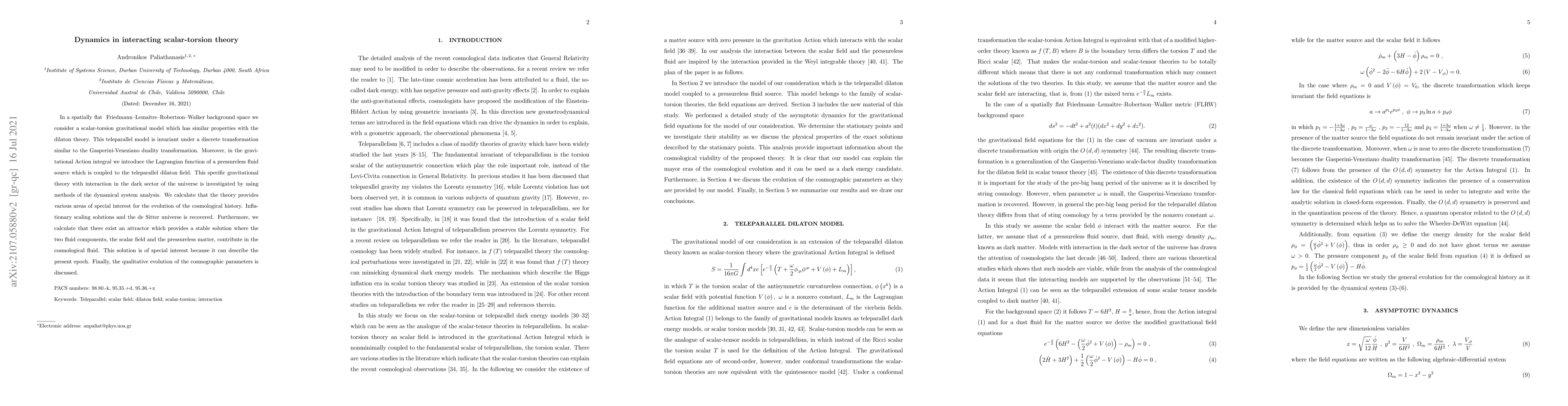 In a spatially flat \ Friedmann--Lema\^{\i}tre--Robertson--Walker background space we consider a scalar-torsion gravitational model which has similar properties with the dilaton theory. This teleparallel model is invariant under a discrete transformation similar to the Gasperini-Veneziano duality transformation. Moreover, in the gravitational Action integral we introduce the Lagrangian function of a pressureless fluid source which is coupled to the teleparallel dilaton field. This specific gravitational theory with interaction in the dark sector of the universe is investigated by using methods of the dynamical system analysis. We calculate that the theory provides various areas of special interest for the evolution of the cosmological history. Inflationary scaling solutions and the de Sitter universe is recovered. Furthermore, we calculate that there exist an attractor which provides a stable solution where the two fluid components, the scalar field and the pressureless matter, contribute in the cosmological fluid. This solution is of special interest because it can describe the present epoch. Finally, the qualitative evolution of the cosmographic parameters is discussed.
