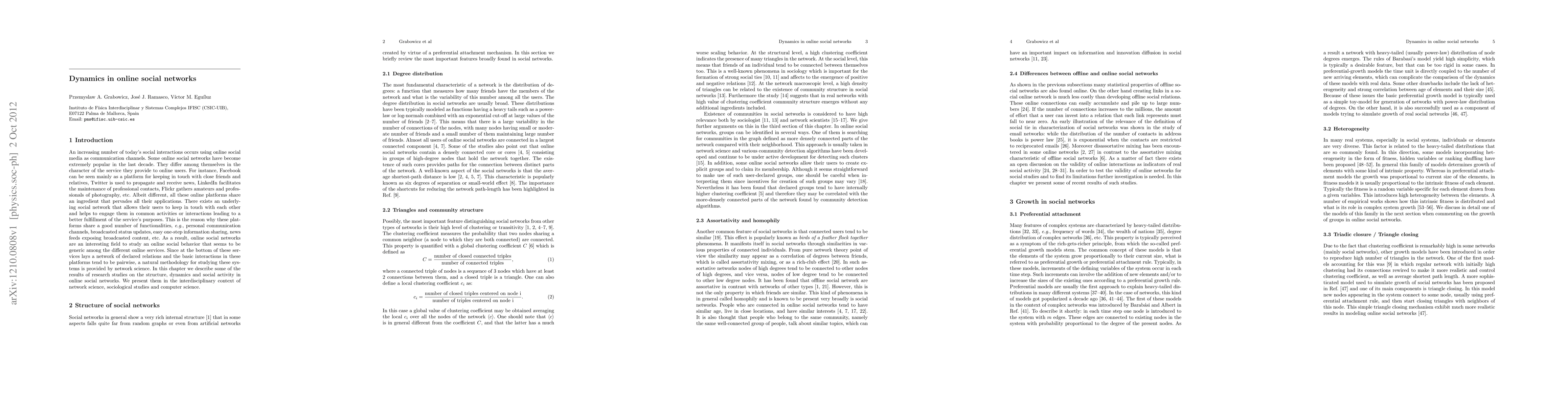 This paper examines the dynamics and structure of online social networks, highlighting their shared underlying social networks and common functionalities such as personal communication and information sharing. It utilizes network science, sociological studies, and computer science to explore these shared interactions and behaviors across platforms like Facebook, Twitter, and LinkedIn.