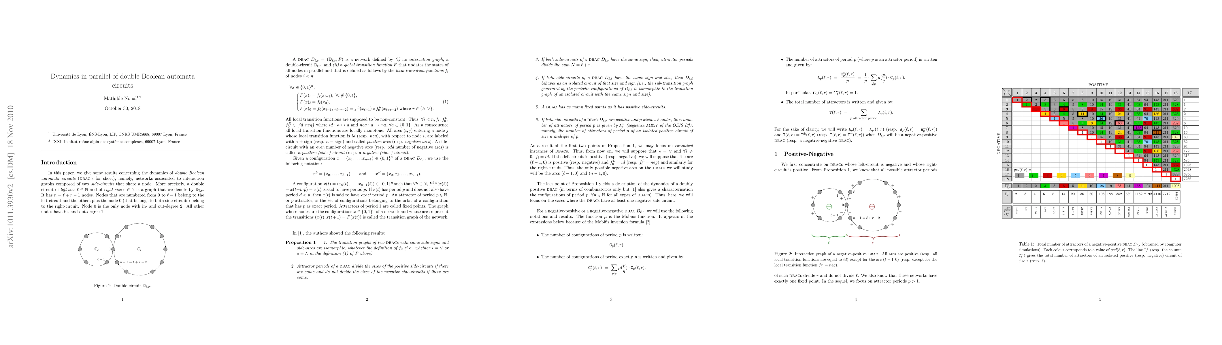 In this paper, we give some results concerning the dynamics of double Boolean automata circuits (dbac's for short), namely, networks associated to interaction graphs composed of two side-circuits that share a node. More precisely, we give formulas for the number of attractors of any period, as well as the total number of attractors of these networks.