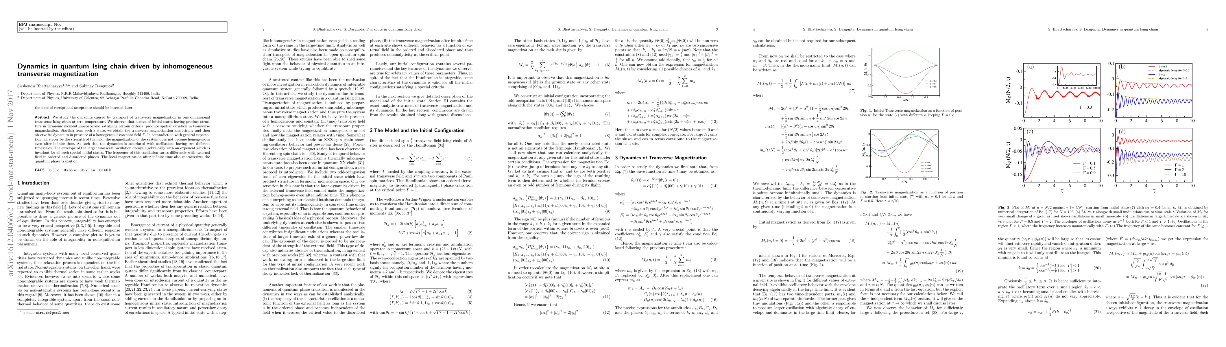 The research analytically studies the dynamics of transverse magnetization in a one-dimensional quantum Ising chain with an inhomogeneous transverse magnetization at zero temperature, using an initial state with a product structure in fermionic momentum-space.