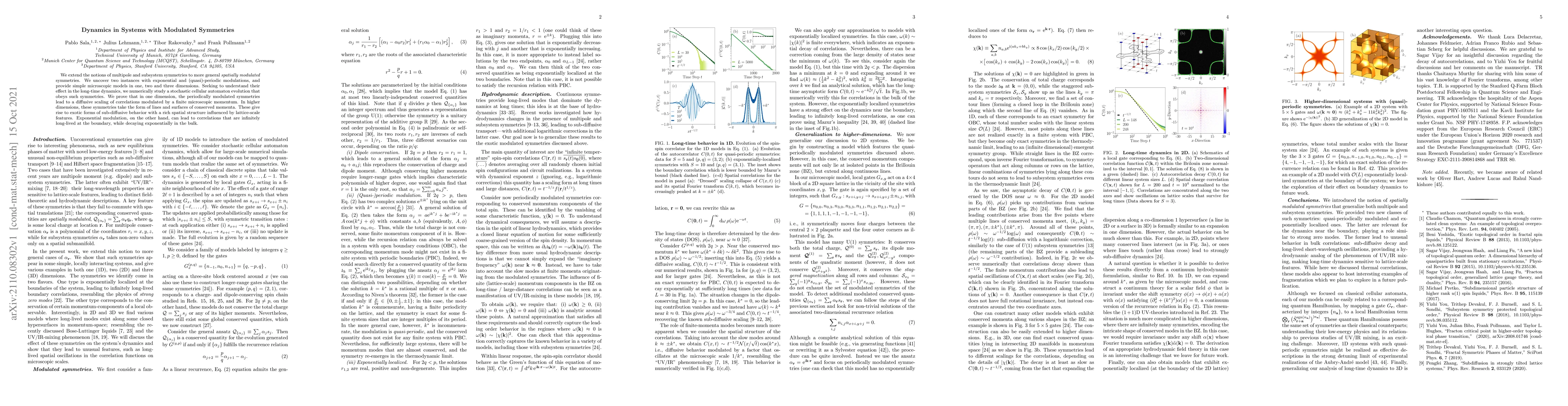 This research introduces spatially modulated symmetries, extending multipole and subsystem symmetries. Numerical studies on a stochastic cellular automaton reveal that these symmetries cause diffusive scaling with modulated correlations in 1D and exotic sub-diffusive behavior with rich spatial structures in higher dimensions. Exponential modulation leads to infinitely long-lived correlations at boundaries.