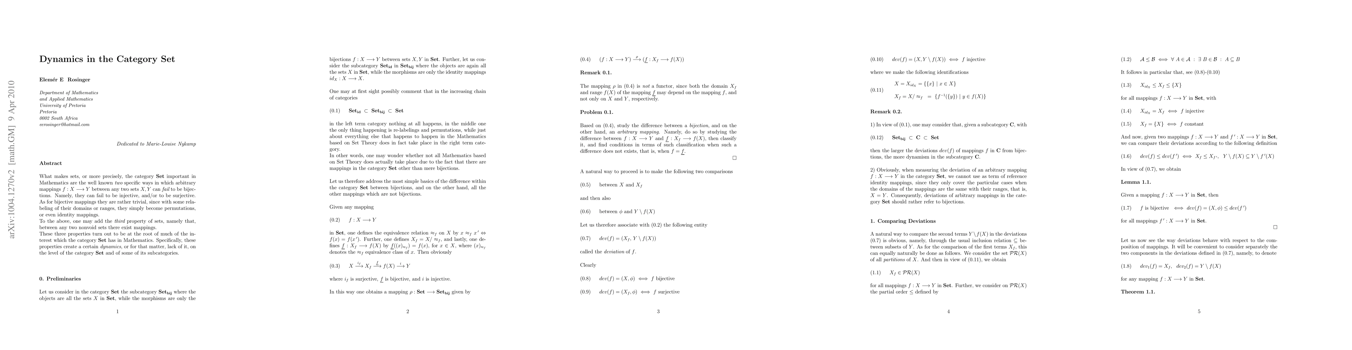 What makes sets, or more precisely, the category {\bf Set} important in Mathematics are the well known {\it two} specific ways in which arbitrary mappings $f : X \longrightarrow Y$ between any two sets $X, Y$ can {\it fail} to be bijections. Namely, they can fail to be injective, and/or to be surjective. As for bijective mappings they are rather trivial, since with some relabeling of their domains or ranges, they simply become permutations, or even identity mappings. \\ To the above, one may add the {\it third} property of sets, namely that, between any two nonvoid sets there exist mappings. \\ These three properties turn out to be at the root of much of the interest which the category {\bf Set} has in Mathematics. Specifically, these properties create a certain {\it dynamics}, or for that matter, lack of it, on the level of the category {\bf Set} and of some of its subcategories.