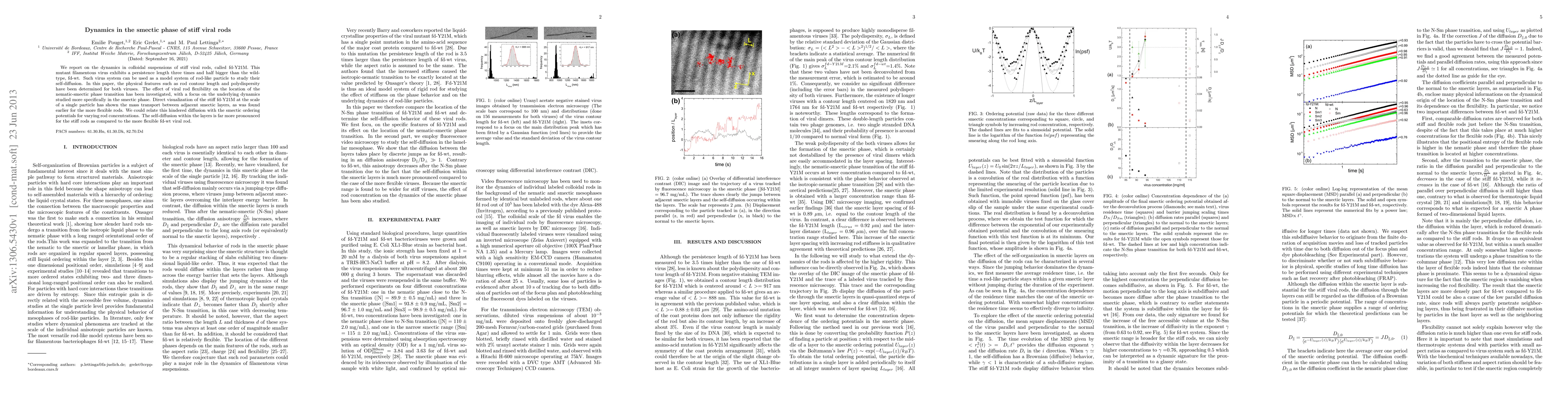 This paper investigates the dynamics of colloidal suspensions of stiff viral rods, specifically fd-Y21M, in the smectic phase, revealing hindered mass transport between layers and more pronounced self-diffusion within layers compared to flexible rods, thus elucidating the impact of rod flexibility on phase transitions.