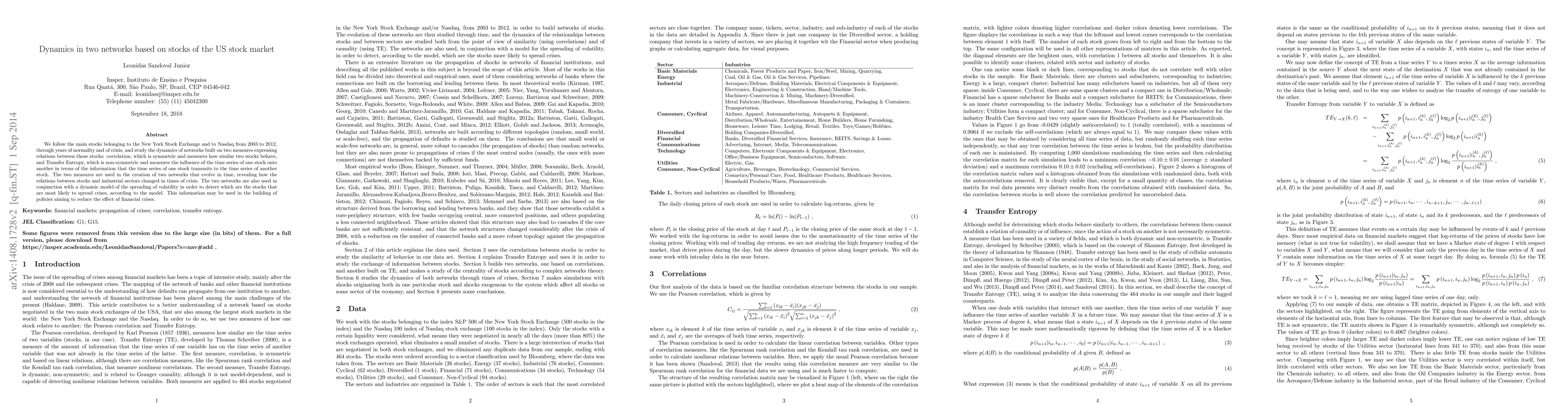 We follow the main stocks belonging to the New York Stock Exchange and to Nasdaq from 2003 to 2012, through years of normality and of crisis, and study the dynamics of networks built on two measures expressing relations between those stocks: correlation, which is symmetric and measures how similar two stocks behave, and Transfer Entropy, which is non-symmetric and measures the influence of the time series of one stock onto another in terms of the information that the time series of one stock transmits to the time series of another stock. The two measures are used in the creation of two networks that evolve in time, revealing how the relations between stocks and industrial sectors changed in times of crisis. The two networks are also used in conjunction with a dynamic model of the spreading of volatility in order to detect which are the stocks that are most likely to spread crises, according to the model. This information may be used in the building of policies aiming to reduce the effect of financial crises.