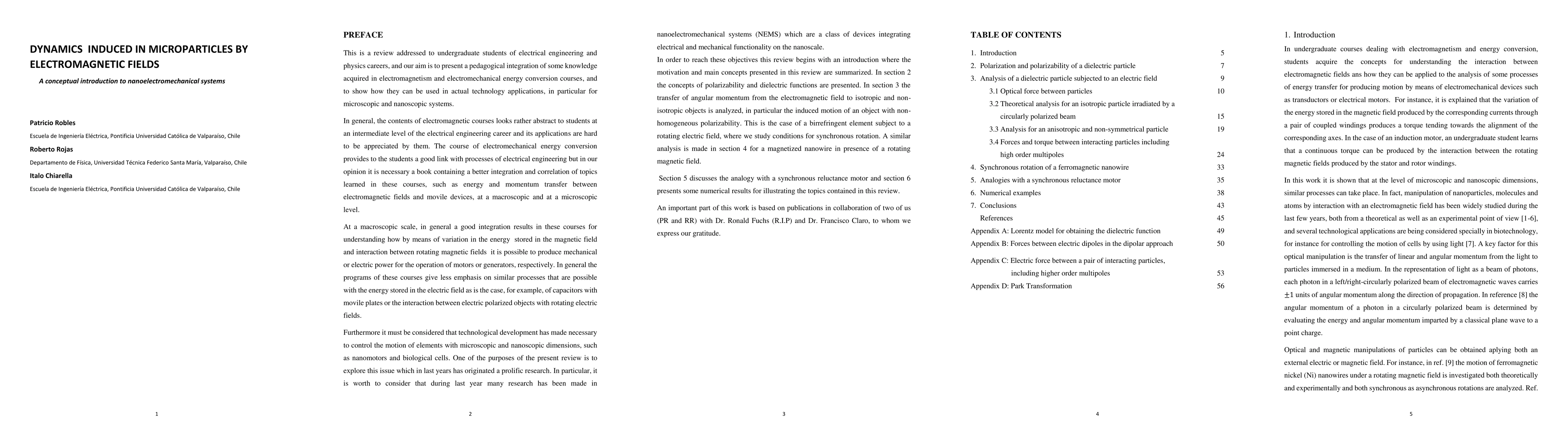 This is a review addressed to undergraduate students of electrical engineering and physics careers, and our aim is to present a pedagogical integration of some knowledge acquired in electromagnetism and electromechanical energy conversion courses, and to show how they can be used in actual technological applications, in particular for microscopic and nanoscopic systems.In this work, we present a conceptual analysis of the generation of optical forces and torques over a system of particles irradiated by an external electromagnetic field, studying the induced dynamics.