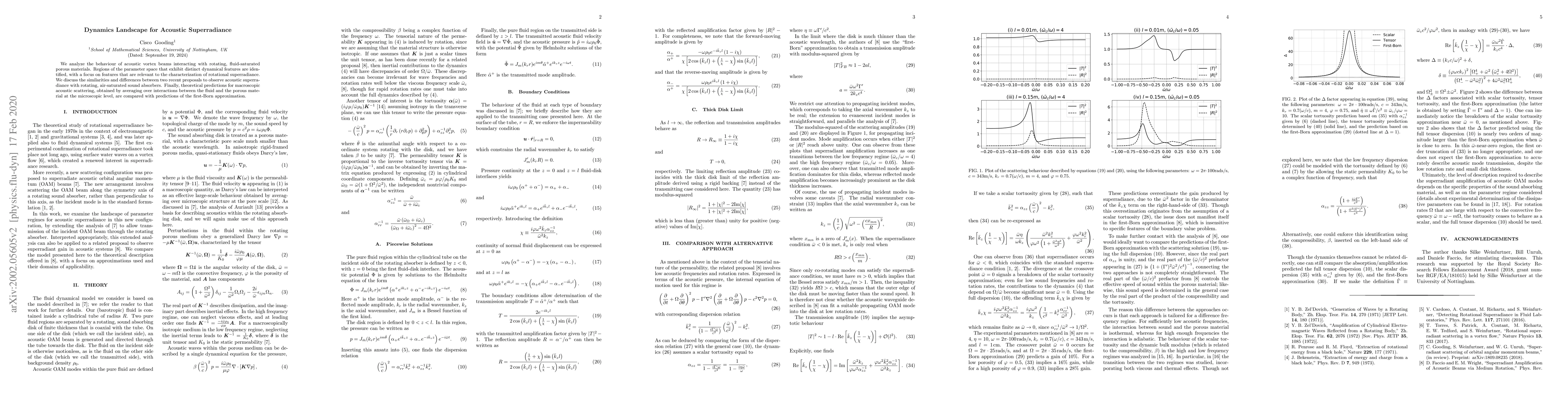 We analyze the behaviour of acoustic vortex beams interacting with rotating, fluid-saturated porous materials. Regions of the parameter space that exhibit distinct dynamical features are identified, with a focus on features that are relevant to the characterization of rotational superradiance. We discuss the similarities and differences between two recent proposals to observe acoustic superradiance with rotating, air-saturated sound absorbers. Finally, theoretical predictions for macroscopic acoustic scattering, obtained by averaging over interactions between the fluid and the porous material at the microscopic level, are compared with predictions of the first-Born approximation.