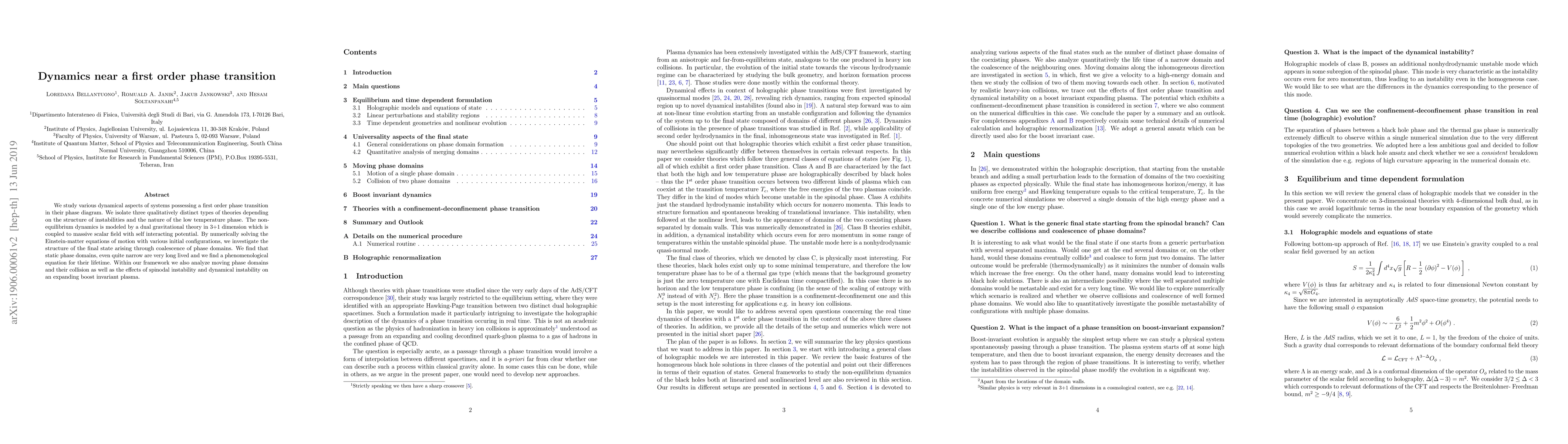 This paper investigates the dynamics of first-order phase transitions using a dual gravitational theory coupled to a massive scalar field. It finds that static phase domains are long-lived and proposes a phenomenological equation for their lifetime, while also analyzing moving domains, their collisions, and the effects of instabilities in an expanding plasma.
