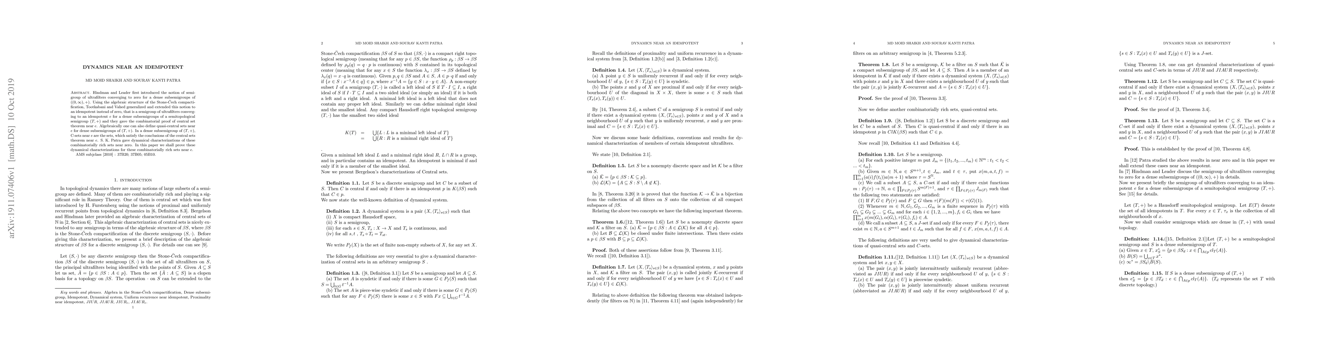 Hindman and Leader first introduced the notion of semigroup of ultrafilters converging to zero for a dense subsemigroups of $((0,\infty),+)$. Using the algebraic structure of the Stone-$\breve{C}$ech compactification, Tootkabani and Vahed generalized and extended this notion to an idempotent instead of zero, that is a semigroup of ultrafilters converging to an idempotent $e$ for a dense subsemigroups of a semitopological semigroup $(T, +)$ and they gave the combinatorial proof of central set theorem near $e$. Algebraically one can also define quasi-central sets near $e$ for dense subsemigroups of $(T, +)$. In a dense subsemigroup of $(T,+)$, C-sets near $e$ are the sets, which satisfy the conclusions of the central sets theorem near $e$. S. K. Patra gave dynamical characterizations of these combinatorially rich sets near zero. In this paper we shall prove these dynamical characterizations for these combinatorially rich sets near $e$.