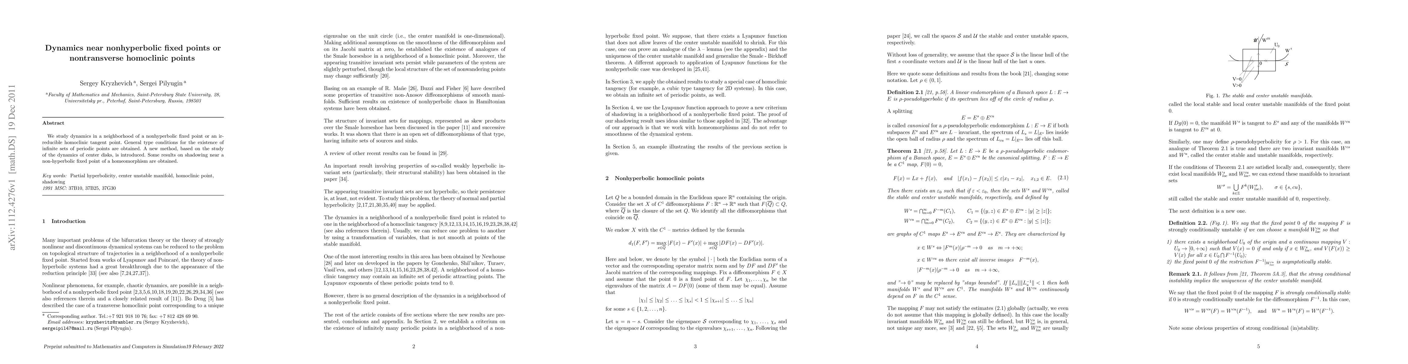 This paper explores dynamics near nonhyperbolic fixed points and nontransverse homoclinic points, introducing a new method based on center disk dynamics. It establishes general conditions for the existence of infinite periodic sets and provides results on shadowing for homeomorphisms.