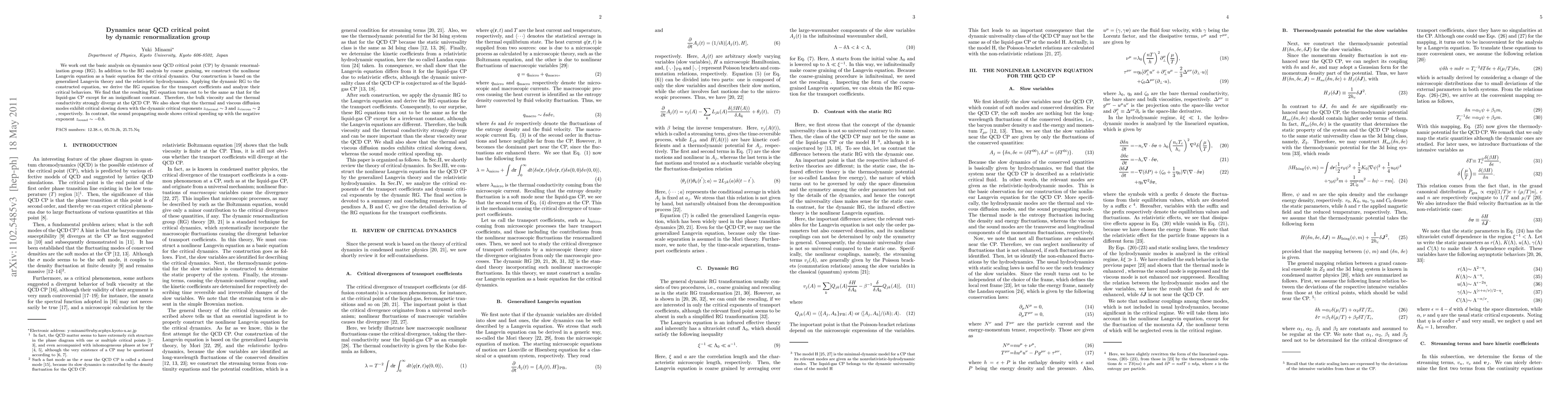 We work out the basic analysis of dynamics near QCD critical point (CP) by dynamic renormalization group (RG). In addition to the RG analysis by coarse graining, we construct the nonlinear Langevin equation as a basic equation for the critical dynamics. Our construction is based on the generalized Langevin theory and the relativistic hydrodynamics. Applying the dynamic RG to the constructed equation, we derive the RG equation for the transport coefficients and analyze their critical behaviors. We find that the resulting RG equation turns out to be the same as that for the liquid-gas CP except for an insignificant constant. Therefore, the bulk viscosity and the thermal conductivity strongly diverge at the QCD CP. We also show that the thermal and viscous diffusion modes exhibit critical slowing down with the dynamic critical exponents $z_{\rm thermal}\sim 3$ and $z_{\rm viscous}\sim 2$, respectively. In contrast, the sound propagating mode shows critical speeding up with the negative exponent $z_{\rm sound}\sim -0.8$.