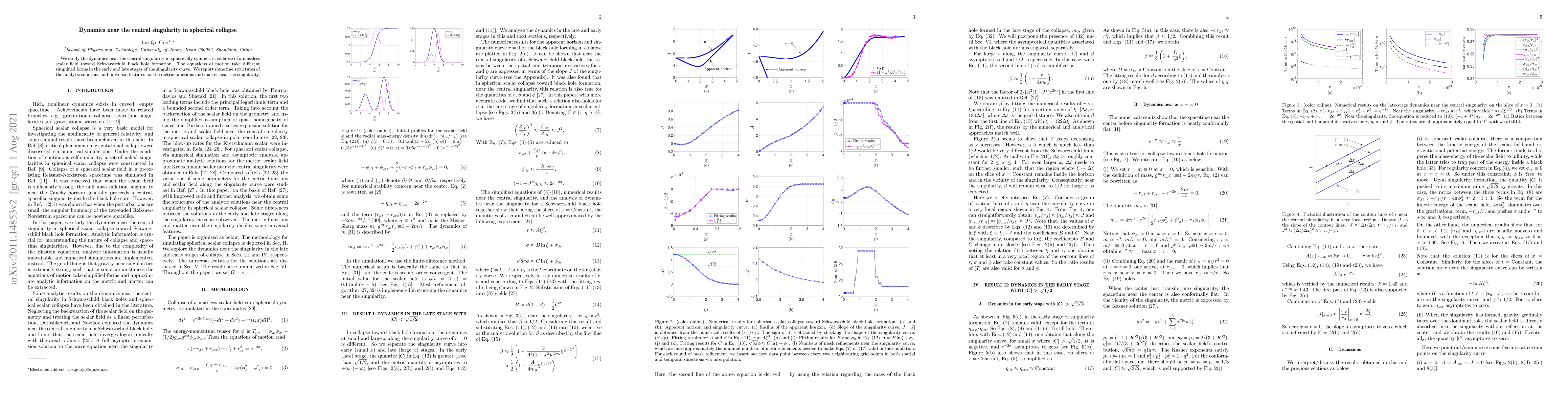 This paper investigates the dynamics of a massless scalar field undergoing spherical collapse towards forming a Schwarzschild black hole, focusing on the central singularity. It reveals distinct simplified forms of the equations of motion in early and late singularity stages, highlighting fine structures and universal features in the metric functions and matter near the singularity.
