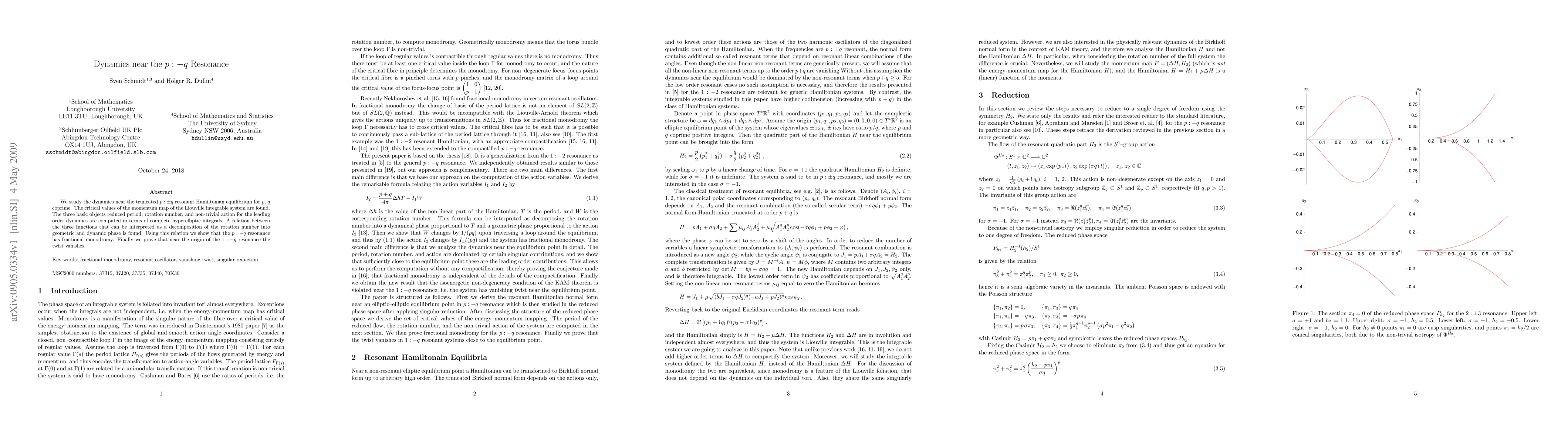 This paper investigates the dynamics near the p : -q resonance in a truncated Hamiltonian system, finding critical values of the momentum map and expressing reduced period, rotation number, and action in terms of complete hyperelliptic integrals. It reveals a fractional monodromy for the p : -q resonance and proves that the twist vanishes near the origin of the 1 : -q resonance.