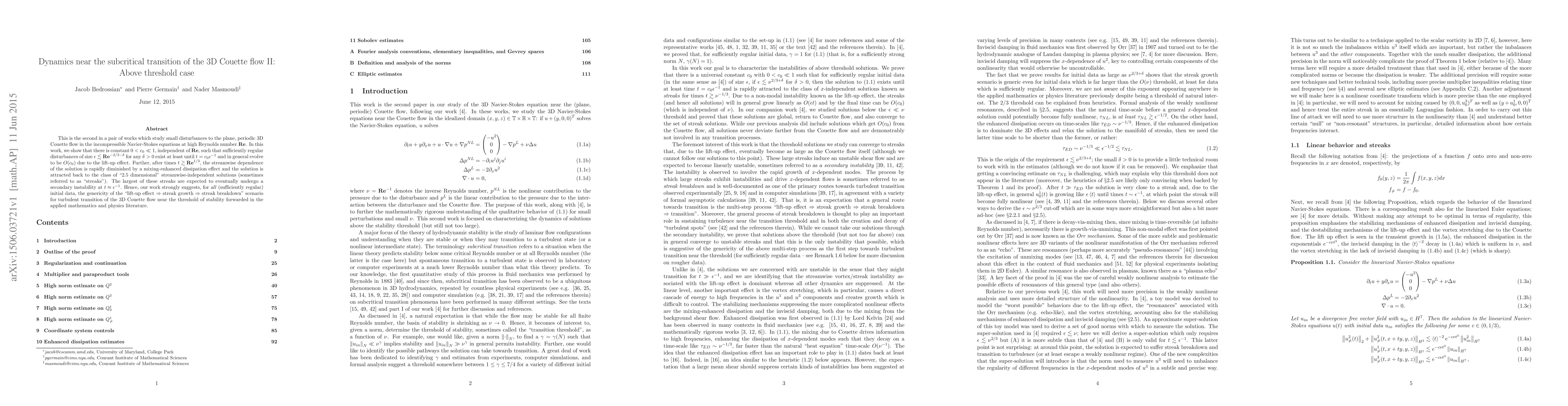 This is the second in a pair of works which study small disturbances to the plane, periodic 3D Couette flow in the incompressible Navier-Stokes equations at high Reynolds number $\textbf{Re}$. In this work, we show that there is constant $0 < c_0 \ll 1$, independent of $\textbf{Re}$, such that sufficiently regular disturbances of size $\epsilon \lesssim \textbf{Re}^{-2/3-\delta}$ for any $\delta > 0$ exist at least until $t = c_0\epsilon^{-1}$ and in general evolve to be $O(c_0)$ due to the lift-up effect. Further, after times $t \gtrsim \textbf{Re}^{1/3}$, the streamwise dependence of the solution is rapidly diminished by a mixing-enhanced dissipation effect and the solution is attracted back to the class of "2.5 dimensional" streamwise-independent solutions (sometimes referred to as "streaks"). The largest of these streaks are expected to eventually undergo a secondary instability at $t \approx \epsilon^{-1}$. Hence, our work strongly suggests, for all (sufficiently regular) initial data, the genericity of the "lift-up effect $\Rightarrow$ streak growth $\Rightarrow$ streak breakdown" scenario for turbulent transition of the 3D Couette flow near the threshold of stability forwarded in the applied mathematics and physics literature.