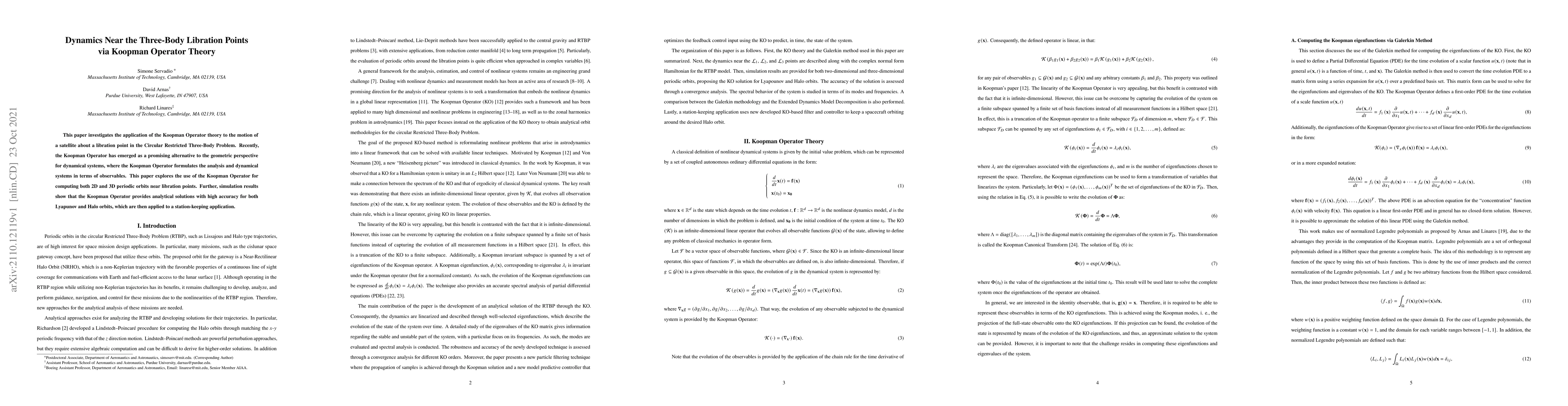 This paper applies Koopman Operator theory to analyze the dynamics near three-body libration points, demonstrating its effectiveness in computing 2D and 3D periodic orbits with high accuracy. Simulation results show the method's success in identifying Lyapunov and Halo orbits for satellite station-keeping.