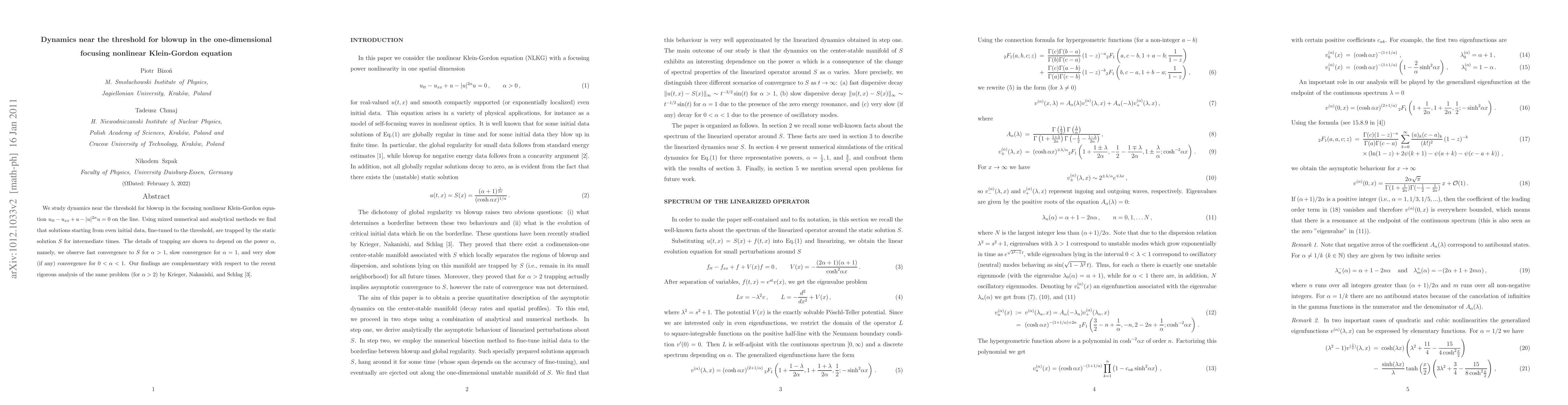 We study dynamics near the threshold for blowup in the focusing nonlinear Klein-Gordon equation $u_{tt}-u_{xx} + u - |u|^{2\alpha} u =0$ on the line. Using mixed numerical and analytical methods we find that solutions starting from even initial data, fine-tuned to the threshold, are trapped by the static solution $S$ for intermediate times. The details of trapping are shown to depend on the power $\alpha$, namely, we observe fast convergence to $S$ for $\alpha>1$, slow convergence for $\alpha=1$, and very slow (if any) convergence for $0<\alpha<1$. Our findings are complementary with respect to the recent rigorous analysis of the same problem (for $\alpha>2$) by Krieger, Nakanishi, and Schlag \cite{kns}.