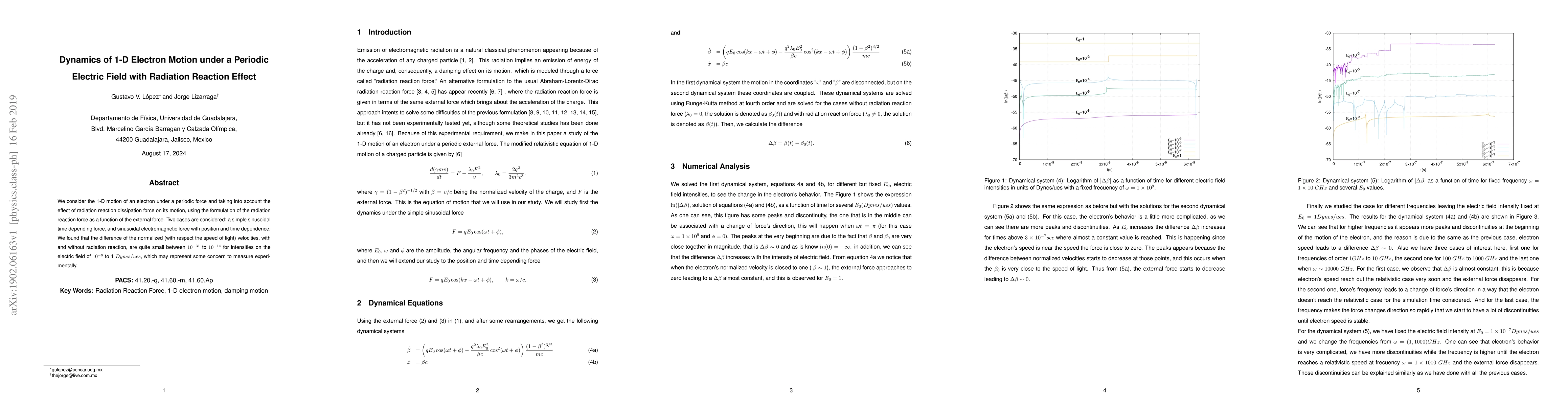 Researchers studied 1-D electron motion under periodic electric fields with radiation reaction effect, finding small differences in velocities between cases with and without radiation reaction for low to moderate intensities.