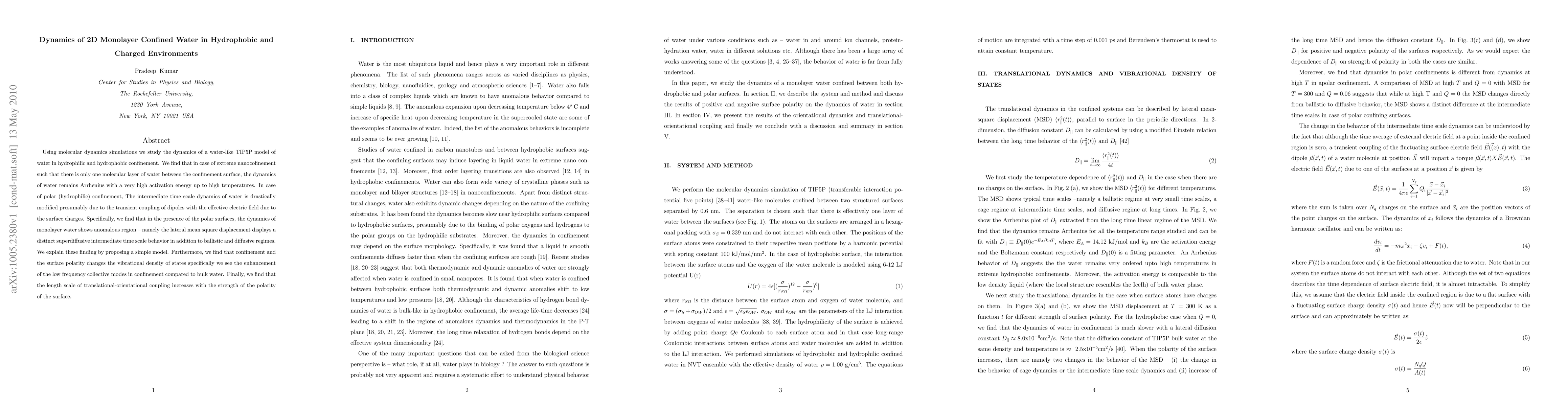 This paper uses molecular dynamics simulations to explore the dynamics of monolayer water confined between hydrophobic and hydrophilic surfaces. It finds that monolayer water exhibits Arrhenius dynamics with high activation energy, while hydrophilic surfaces induce superdiffusive behavior in intermediate time scales due to dipole coupling with surface charges.
