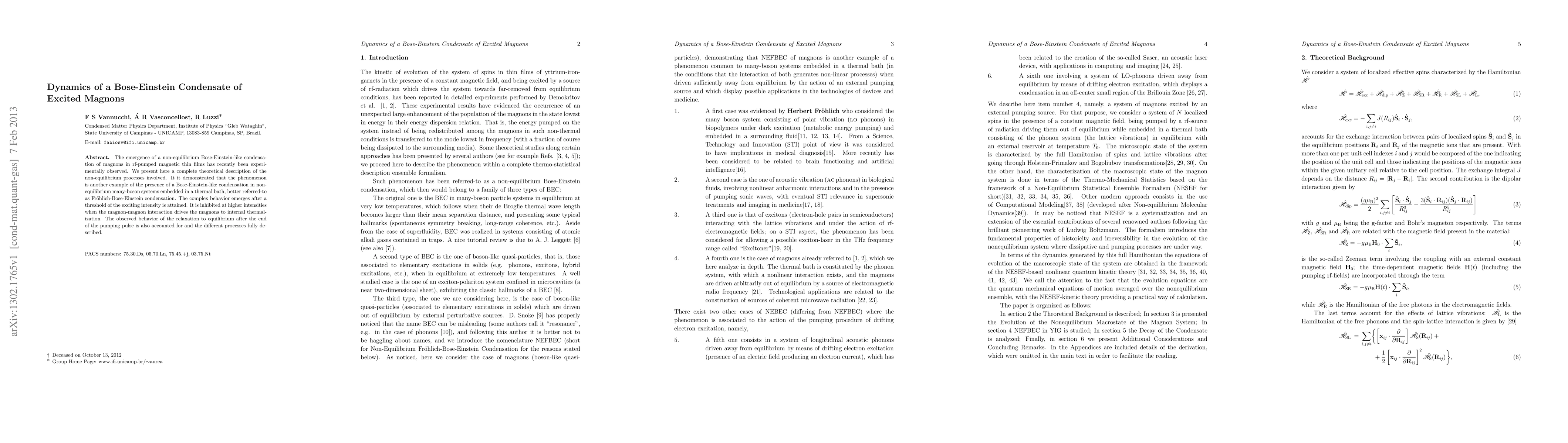 This paper provides a theoretical framework for the non-equilibrium Bose-Einstein-like condensation of excited magnons in rf-pumped magnetic thin films, describing the processes that lead to this phenomenon and the transition to thermalization as interaction intensity changes. It explains the relaxation dynamics after the pumping pulse ends.