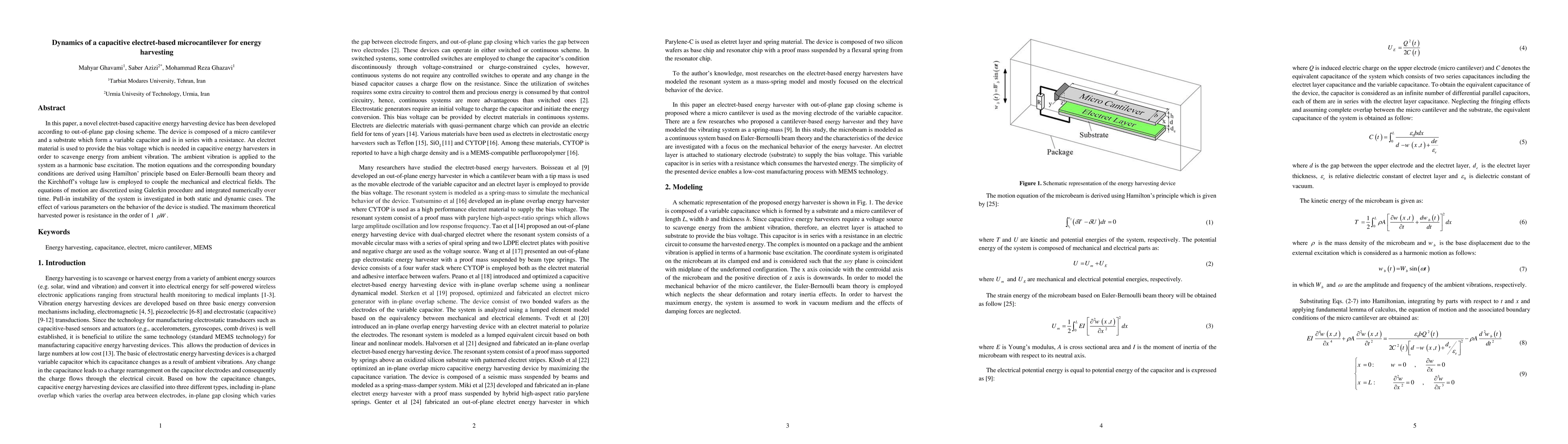 This paper develops a novel capacitive electret-based microcantilever for energy harvesting, utilizing an out-of-plane gap closing scheme. The device's maximum theoretical harvested power is estimated at 1 micro-watt, with a focus on investigating pull-in instability and parameter effects.
