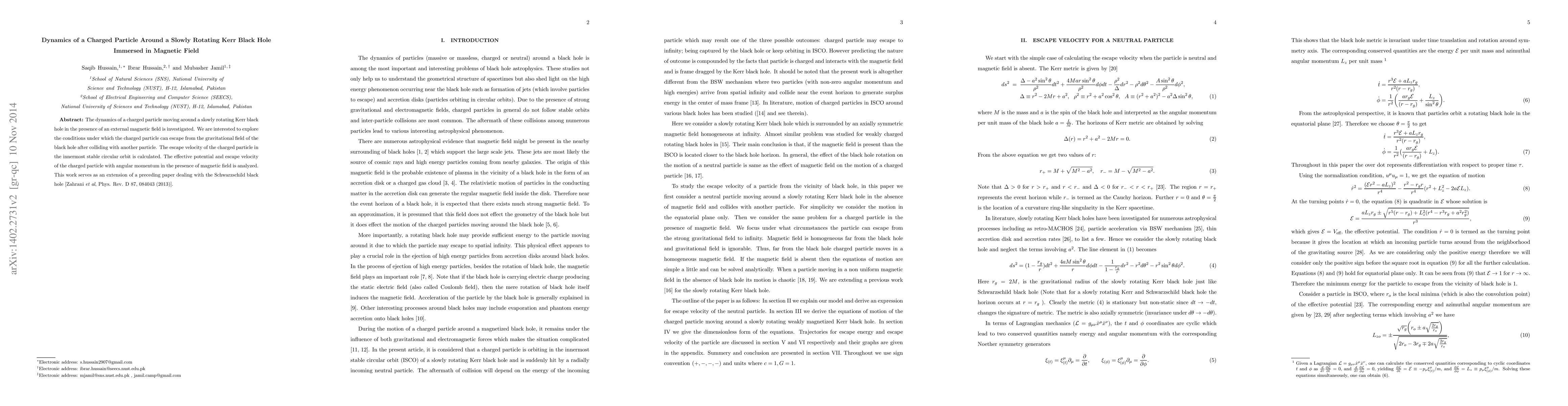 This paper investigates the dynamics of a charged particle around a slowly rotating Kerr black hole influenced by an external magnetic field, focusing on the conditions for particle escape after collisions. It calculates the escape velocity in the innermost stable circular orbit and analyzes the effective potential and angular momentum effects in the magnetic field context.