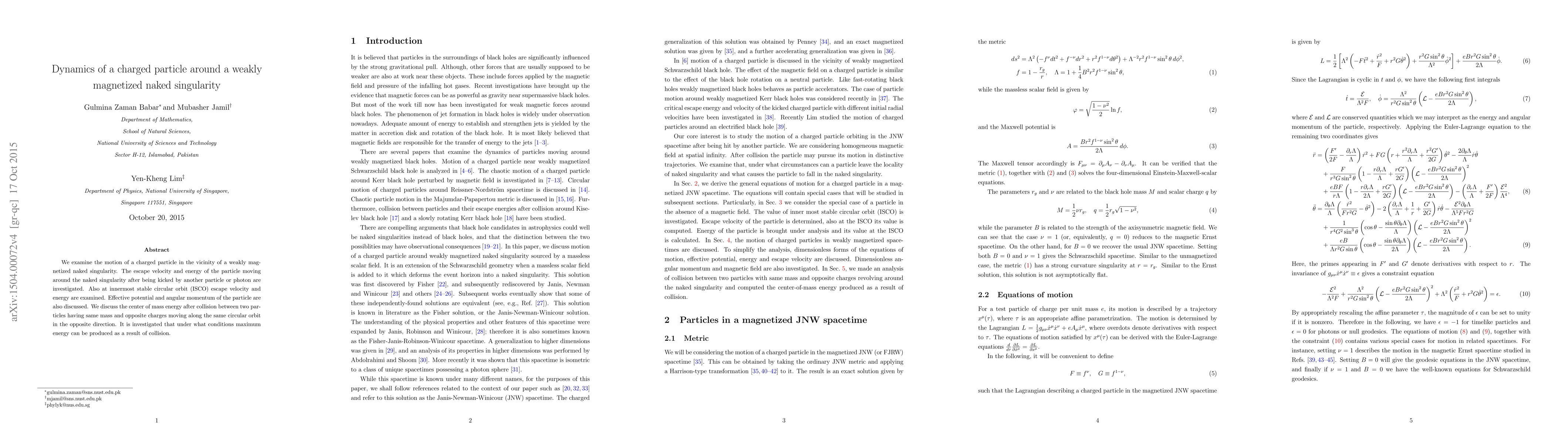 This paper investigates the dynamics of a charged particle near a weakly magnetized naked singularity, focusing on escape velocity, energy, and effective potential. It also explores the center of mass energy during collisions of oppositely charged particles on opposite circular orbits, determining conditions for maximum energy production.