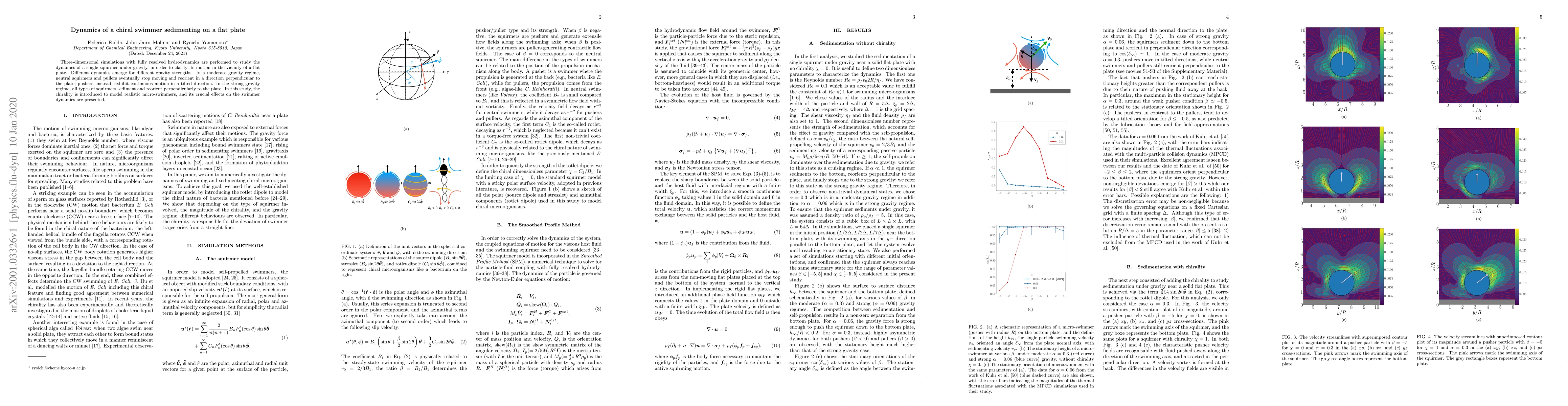 Three-dimensional simulations with fully resolved hydrodynamics are performed to study the dynamics of a single squirmer under gravity, in order to clarify its motion in the vicinity of a flat plate. Different dynamics emerge for different gravity strengths. In a moderate gravity regime, neutral squirmers and pullers eventually stop moving and reorient in a direction perpendicular to the plate; pushers, instead, exhibit continuous motion in a tilted direction. In the strong gravity regime, all types of squirmers sediment and reorient perpendicularly to the plate. In this study, the chirality is introduced to model realistic micro-swimmers, and its crucial effects on the swimmer dynamics are presented.