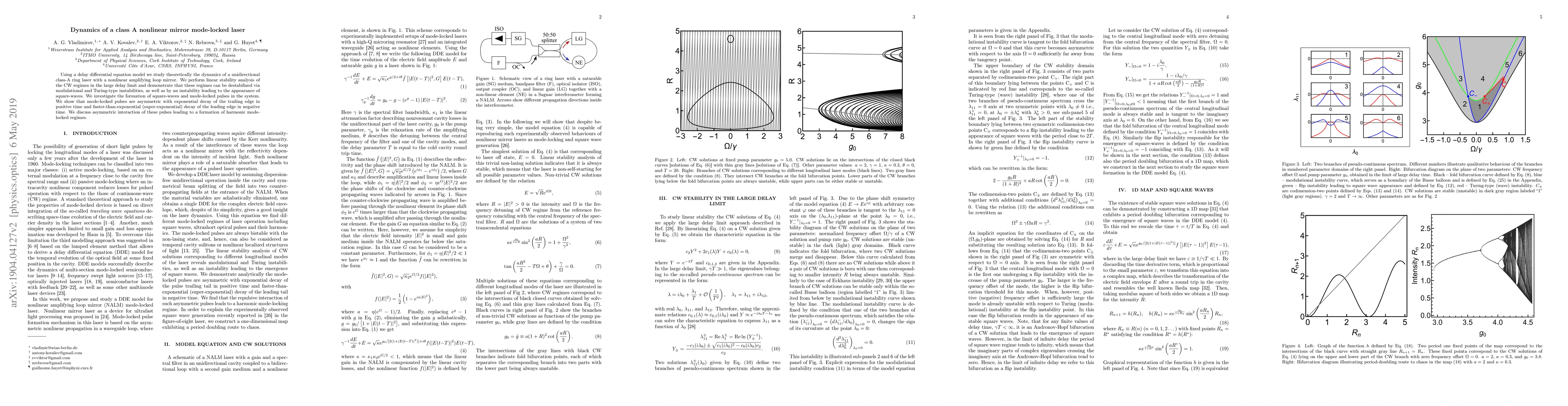 This paper studies the dynamics of a class A nonlinear mirror mode-locked laser using a delay differential equation model, revealing instabilities that lead to the formation of square-wave pulses and mode-locked regimes with asymmetric, super-exponential decay characteristics. The research highlights the complex interactions resulting in harmonic mode-locking.