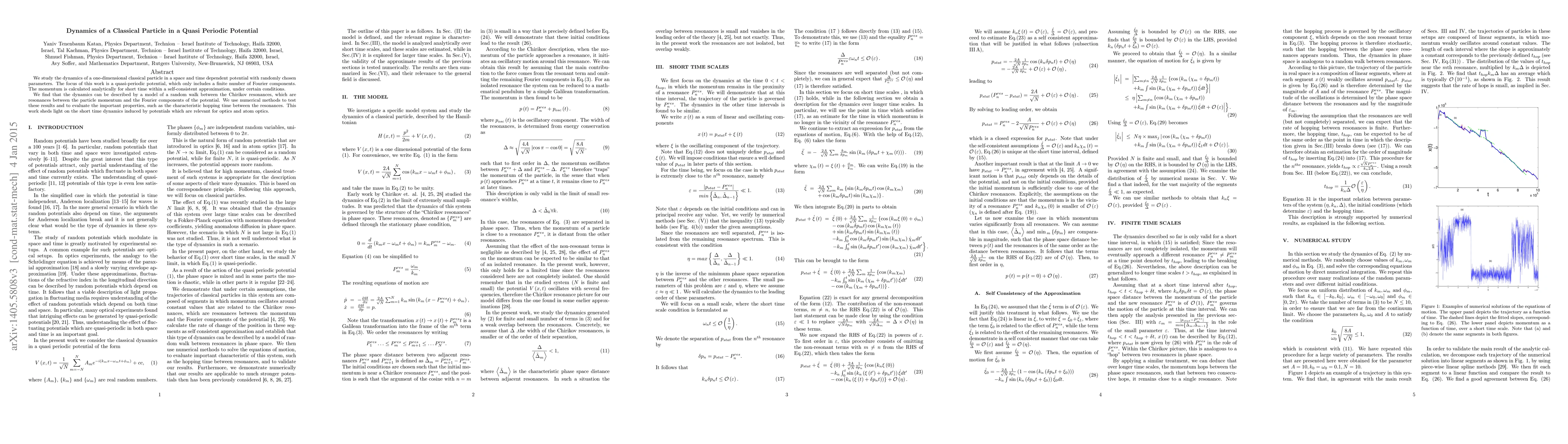This paper investigates the dynamics of a classical particle in a quasi-periodic potential, revealing a random walk model between Chirikov resonances. Analytical and numerical methods are used to determine the characteristic hopping time, providing insights into the short-time dynamics relevant for optics and atom optics.