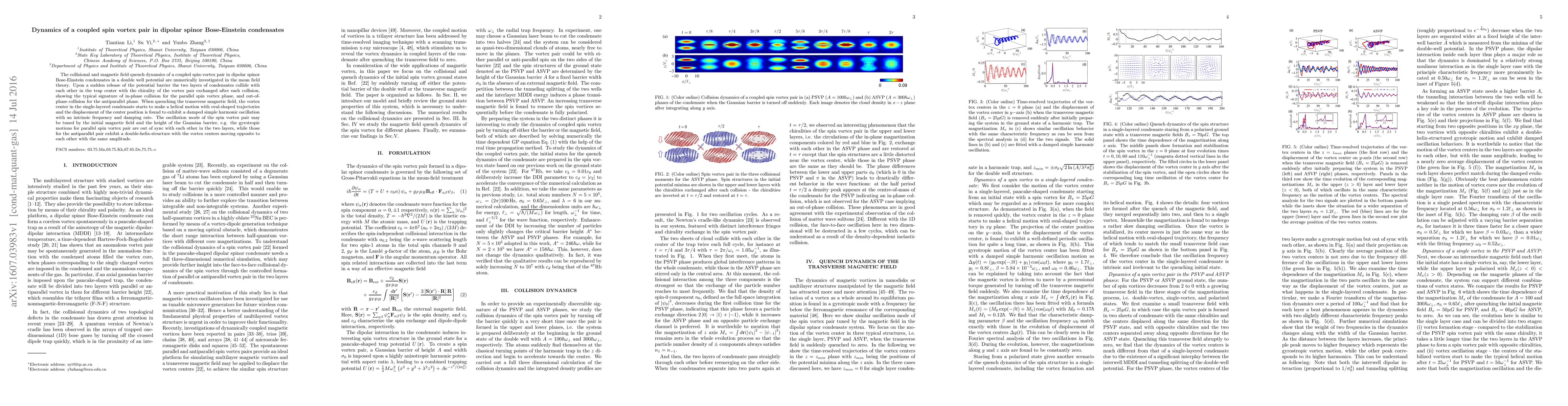 This paper investigates the dynamics of a coupled spin vortex pair in dipolar spinor Bose-Einstein condensates, focusing on collisional and magnetic field quench effects. Numerical simulations reveal distinct collisional behaviors and helical motion patterns in the vortex centers, with the dynamics tunable by initial conditions and magnetic field strength.