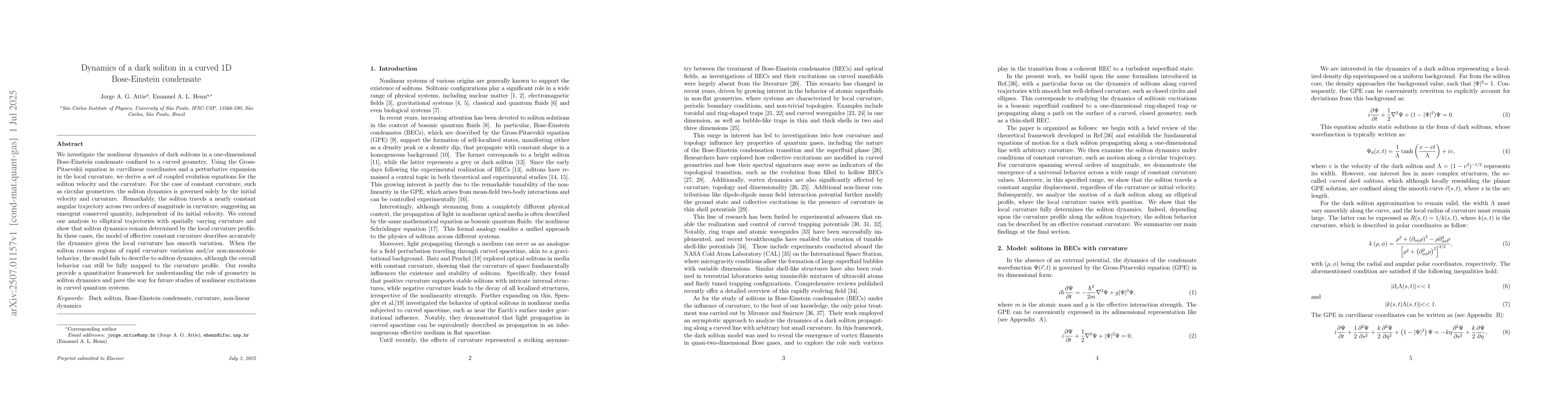 We investigate the nonlinear dynamics of dark solitons in a one-dimensional Bose-Einstein condensate confined to a curved geometry. Using the Gross-Pitaevskii equation in curvilinear coordinates and a perturbative expansion in the local curvature, we derive a set of coupled evolution equations for the soliton velocity and the curvature. For the case of constant curvature, such as circular geometries, the soliton dynamics is governed solely by the initial velocity and curvature. Remarkably, the soliton travels a nearly constant angular trajectory across two orders of magnitude in curvature, suggesting an emergent conserved quantity, independent of its initial velocity. We extend our analysis to elliptical trajectories with spatially varying curvature and show that soliton dynamics remain determined by the local curvature profile. In these cases, the model of effective constant curvature describes accurately the dynamics given the local curvature has smooth variation. When the soliton crosses regions of rapid curvature variation and/or non-monotonic behavior, the model fails to describe to soliton dynamics, although the overall behavior can still be fully mapped to the curvature profile. Our results provide a quantitative framework for understanding the role of geometry in soliton dynamics and pave the way for future studies of nonlinear excitations in curved quantum systems.